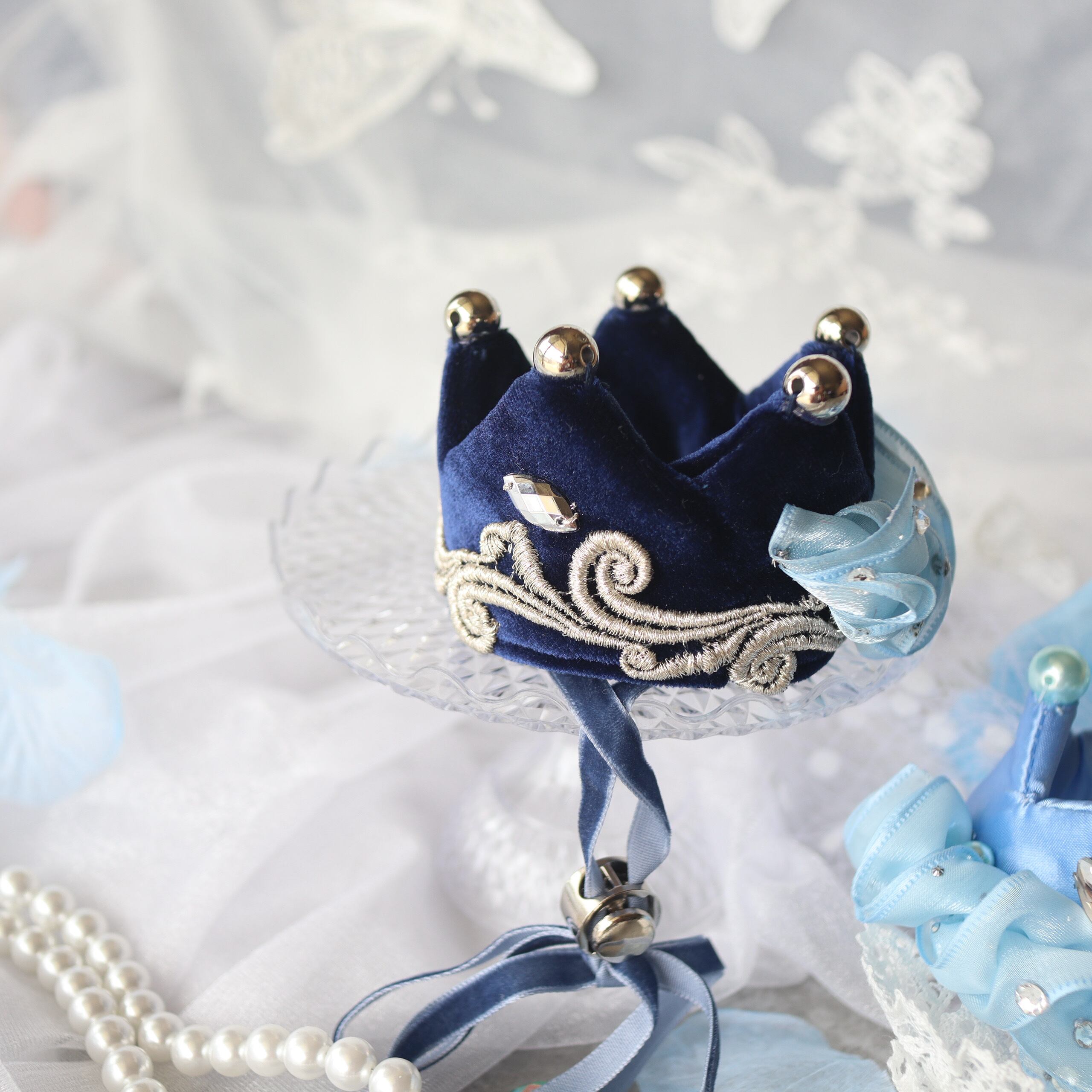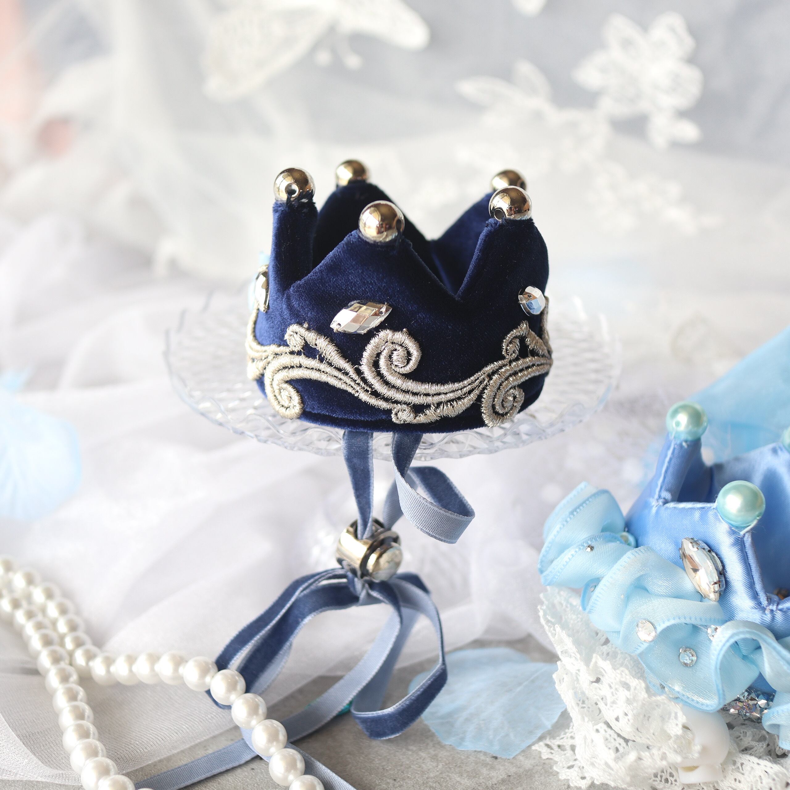 王子さまのクラウンには、上品な光沢をたたえるベルベット生地を採用。シンプルなシルエットに、美しい刺繍をほどこすことで、豪華なブースにも映える華やかさを持ちながら、どこか優雅で控えめな王子さまらしさを感じさせる仕上がりにしました。