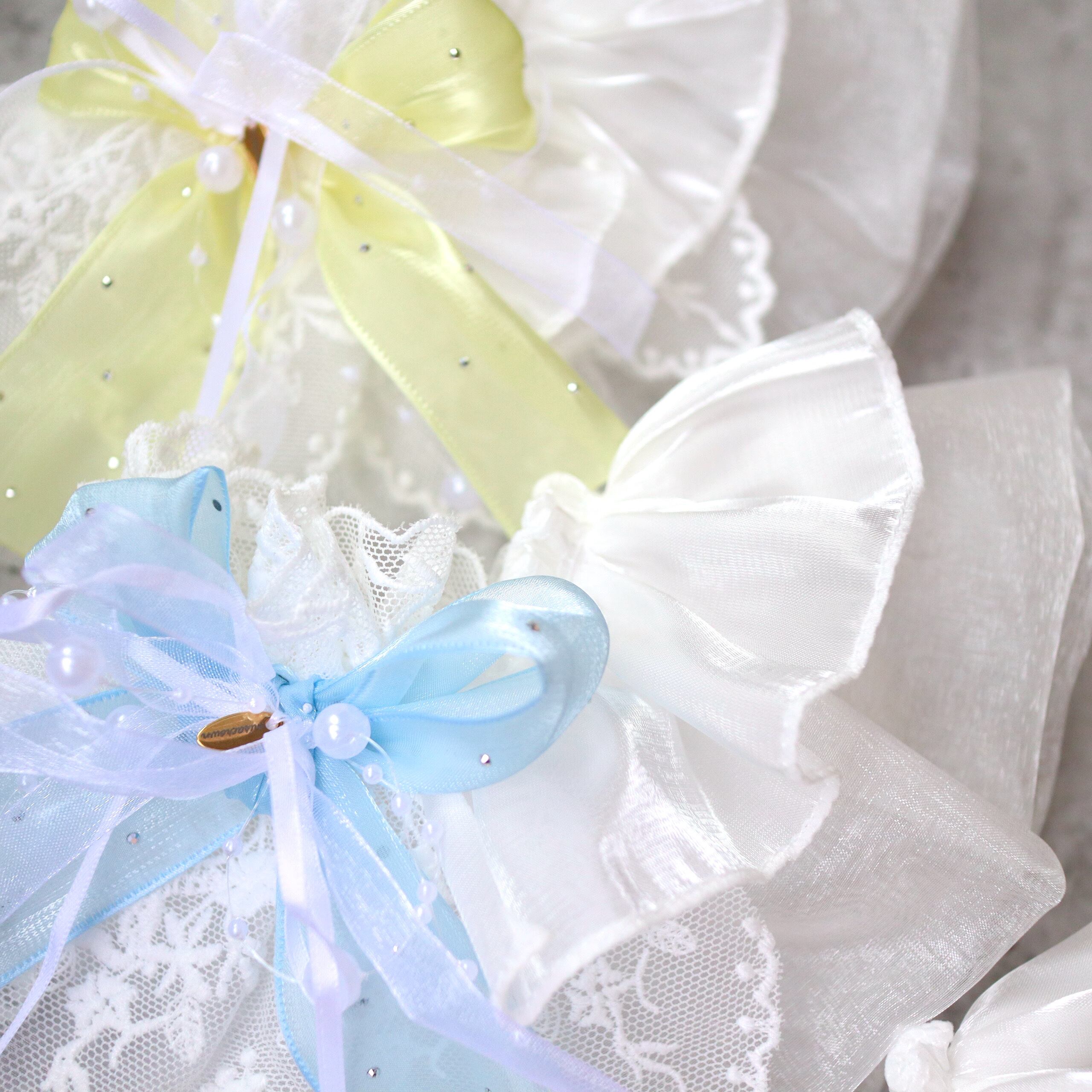 繊細なレース、たっぷりギャザーを寄せた光沢のある生地、異なる素材を丁寧に組み合わせて、一点ずつ仕立てました。
