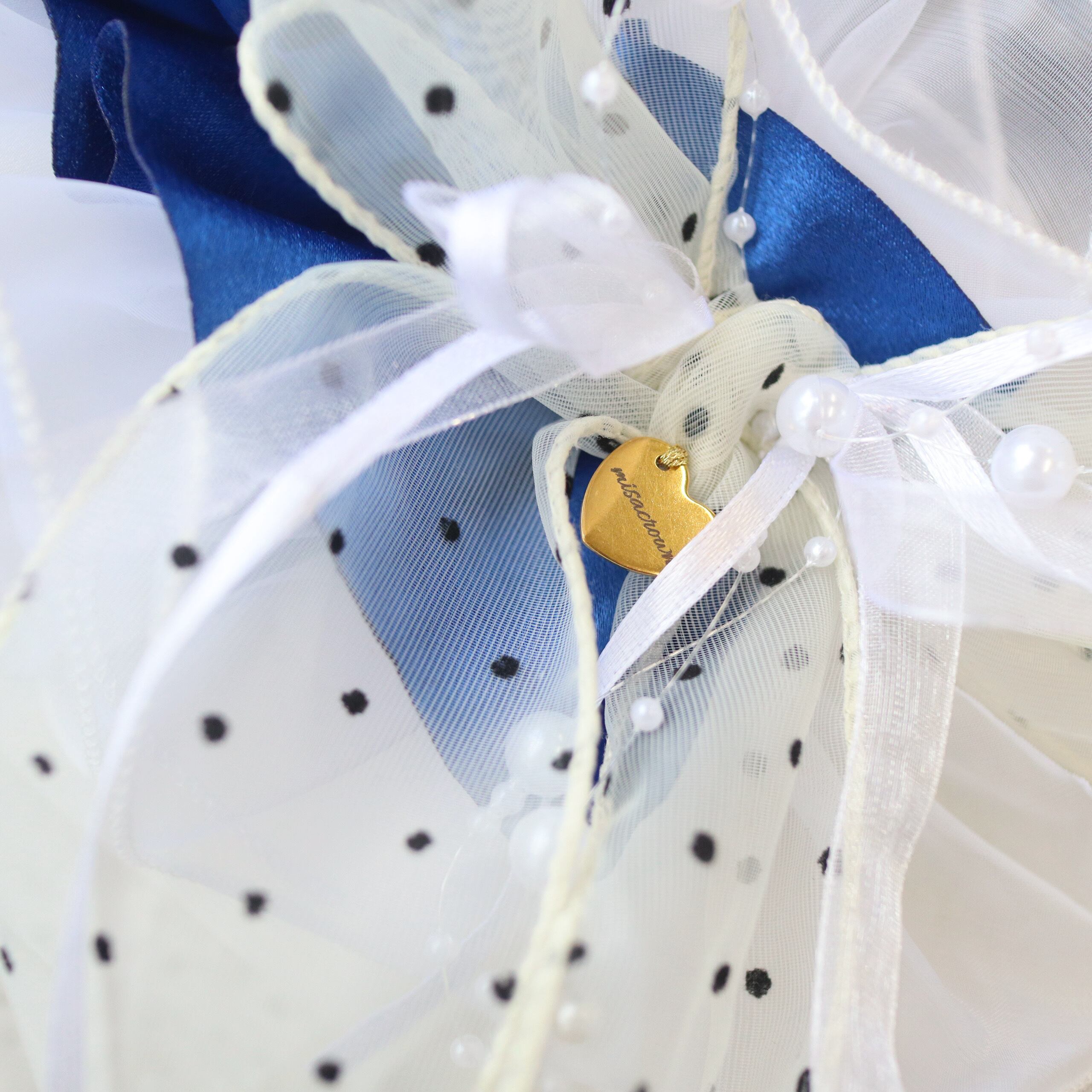 立体的なクラウンにはドット生地からフリルを作り、パールをあしらい、上品で華やかな印象に。