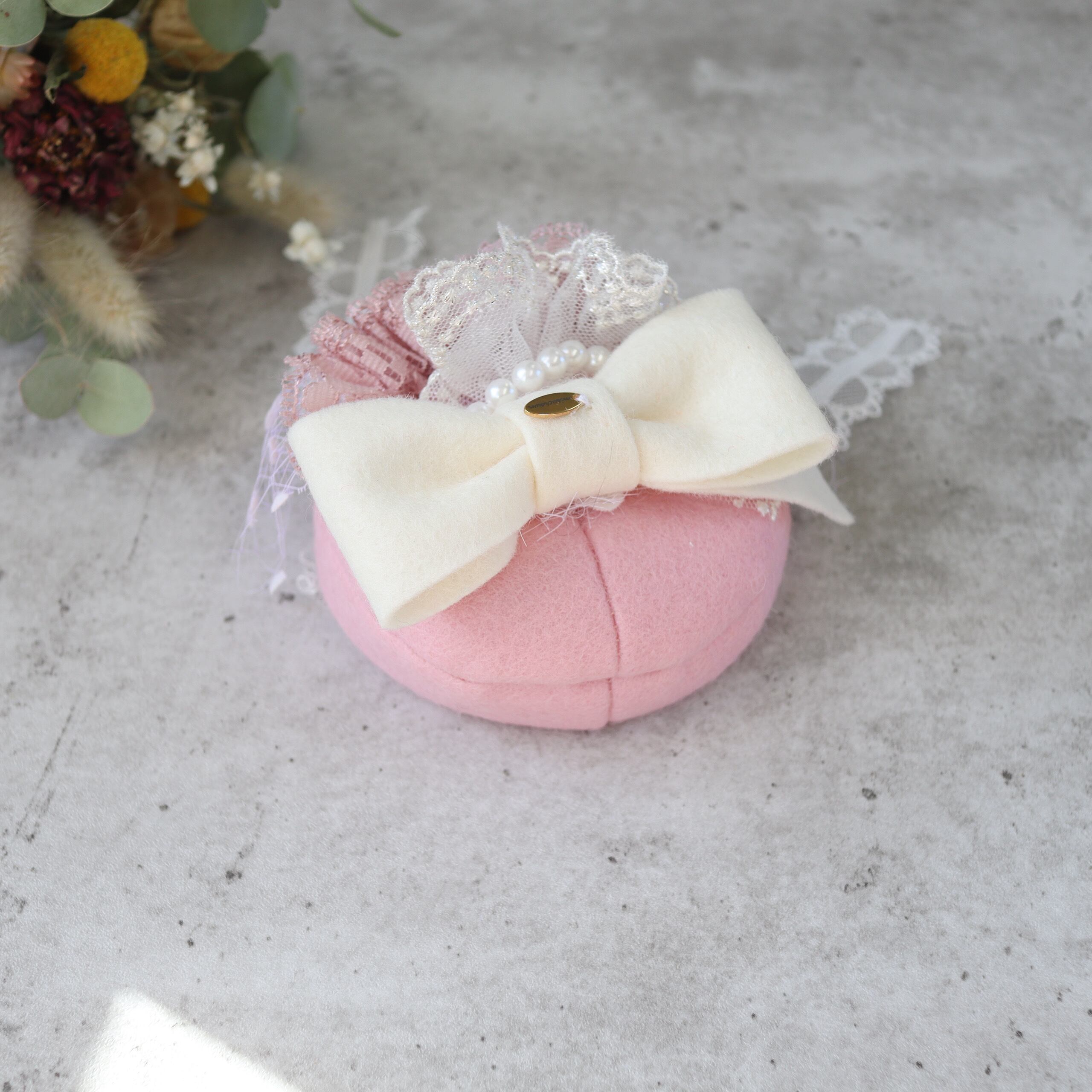 お花が咲く季節を思わせるやわらかな色合いに、繊細なレースやパール、チュールを重ね、上品で華やかな雰囲気に仕上げました