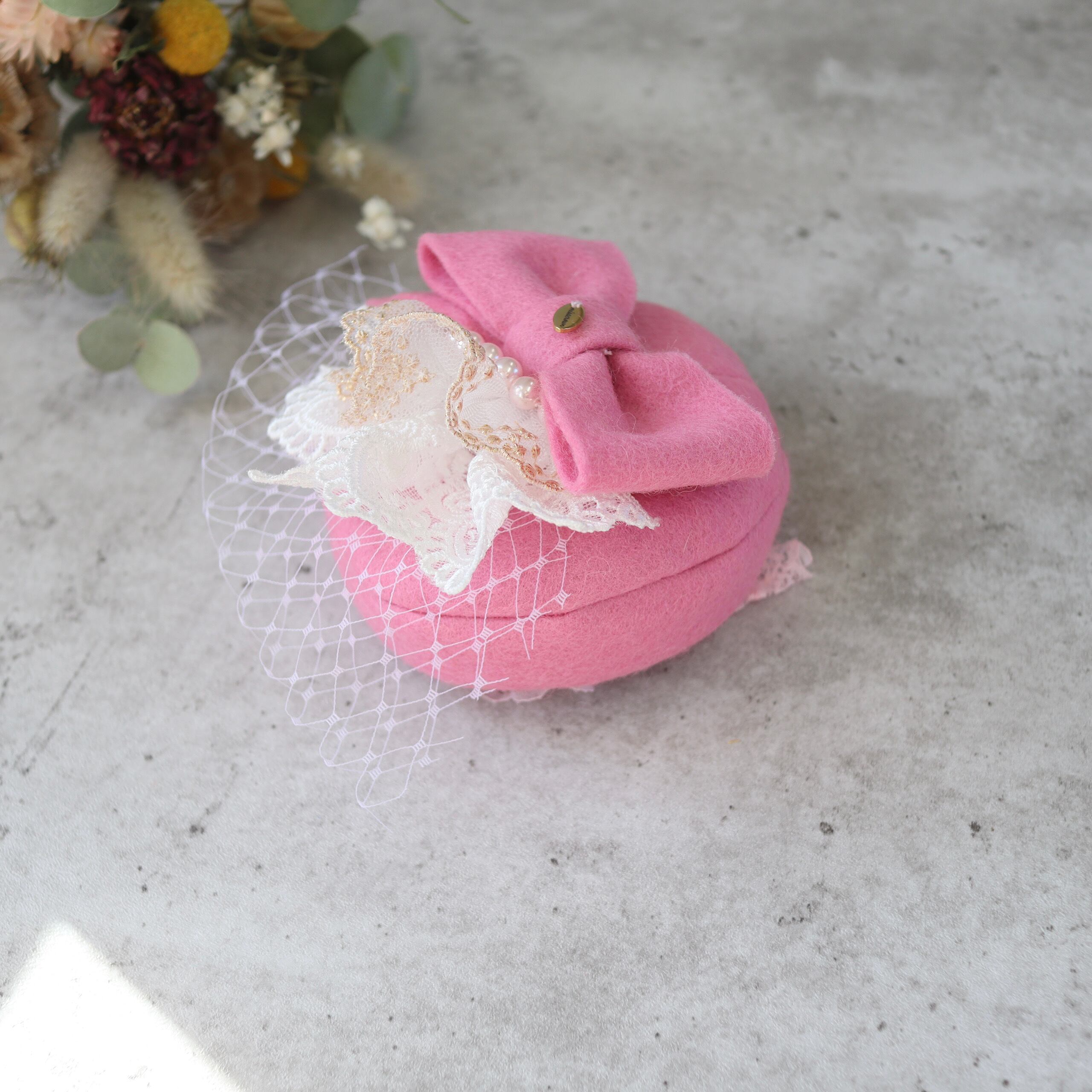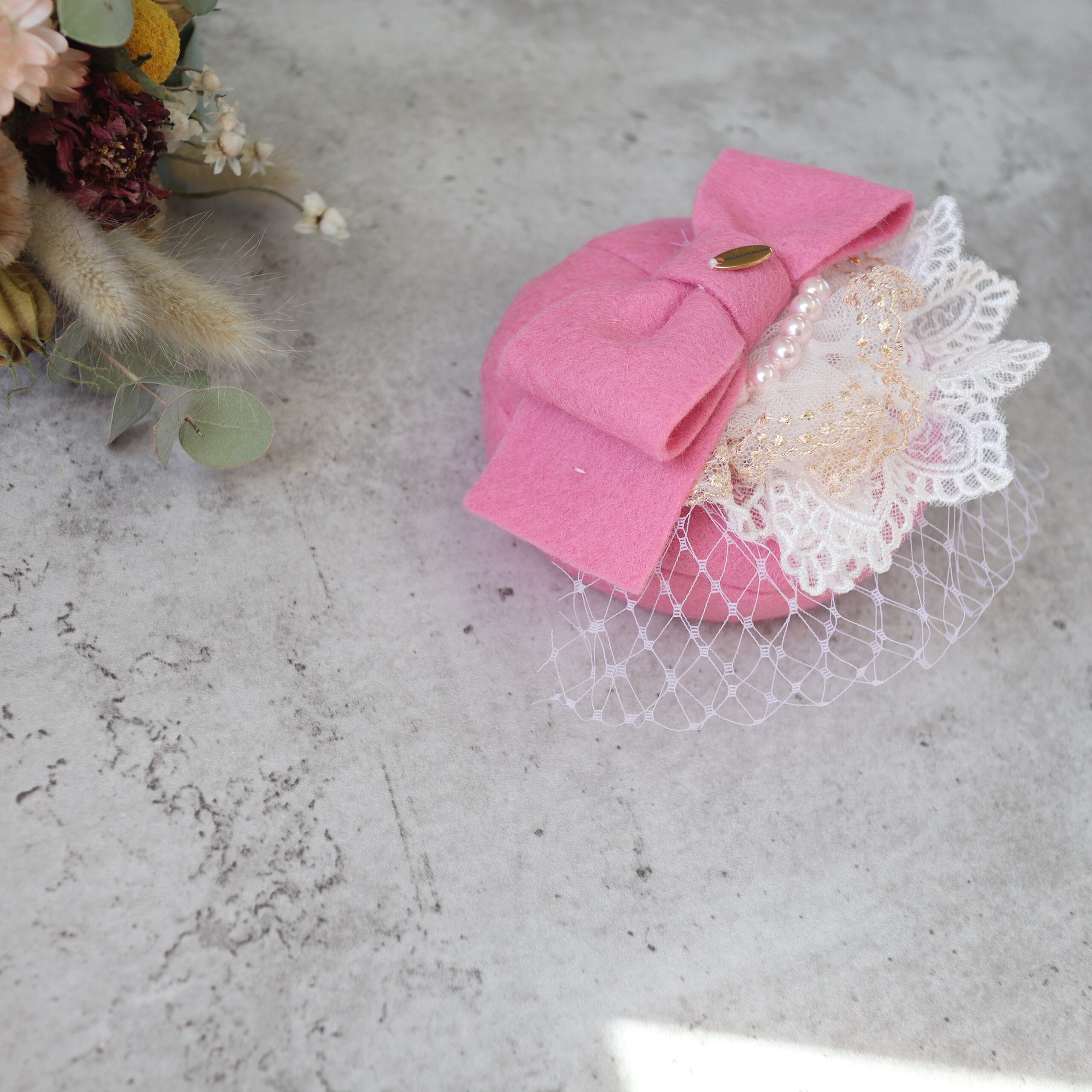 ふんわりと優しいピンクが、春の空気をまとったようなトーク帽。