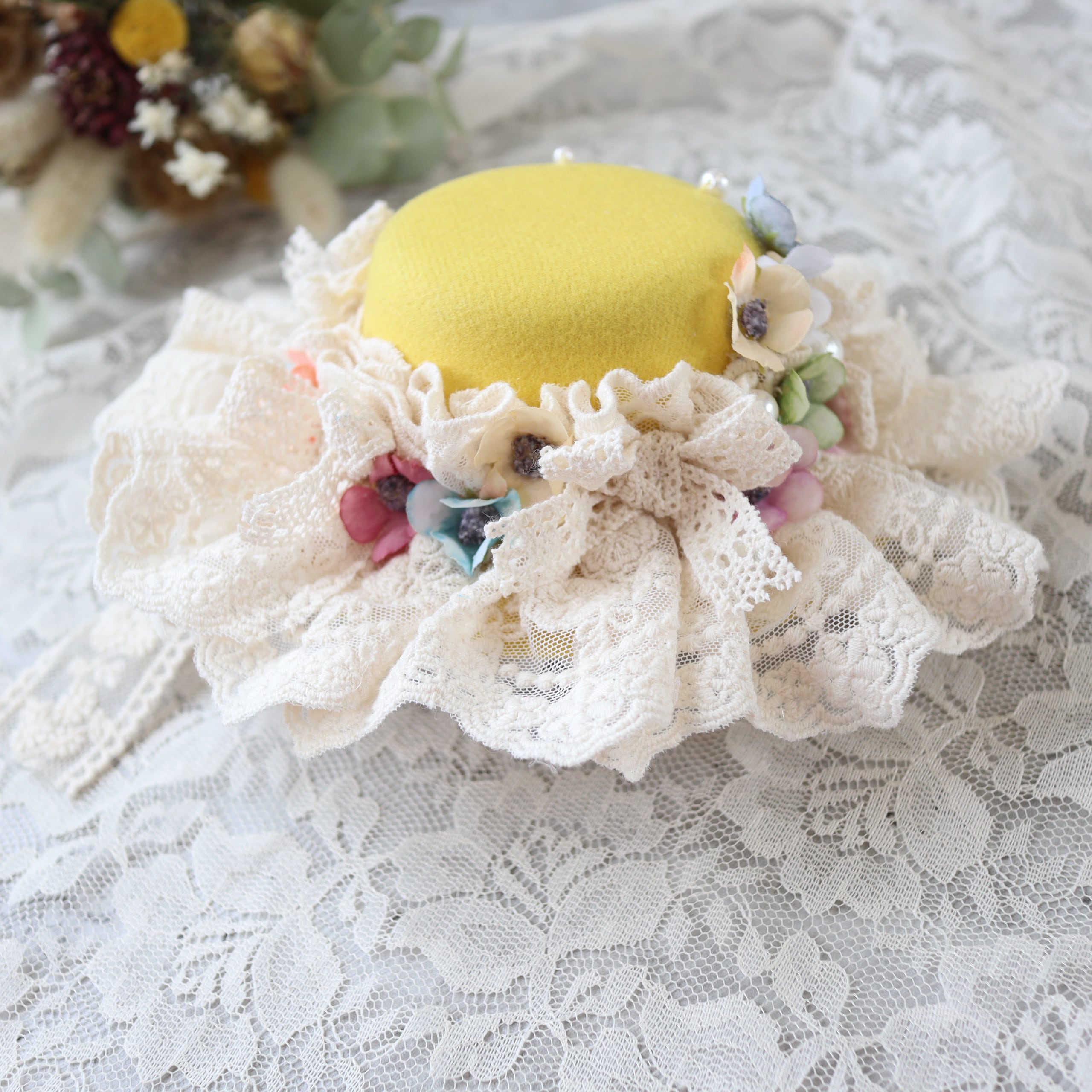 くすみカラーのお花と手染めレースを合わせ、