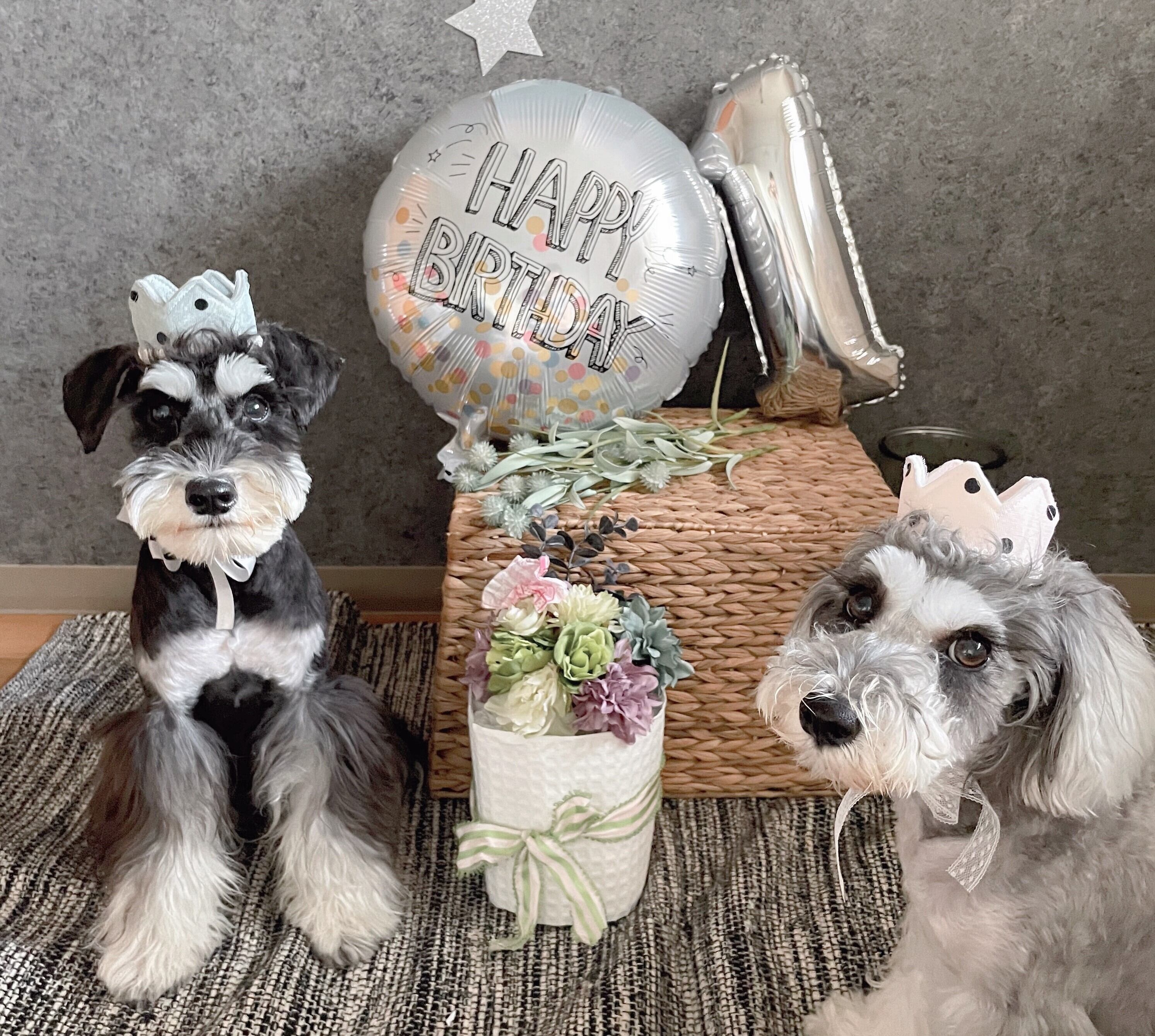 special thanks・・・お客様フォト/ お揃い撮影で、とっても可愛いですね♪左 nutsくん/6kg 右 cocoちゃん/7kg 着用(クラウンにパールは付いている仕様に、変更となっています♪)
