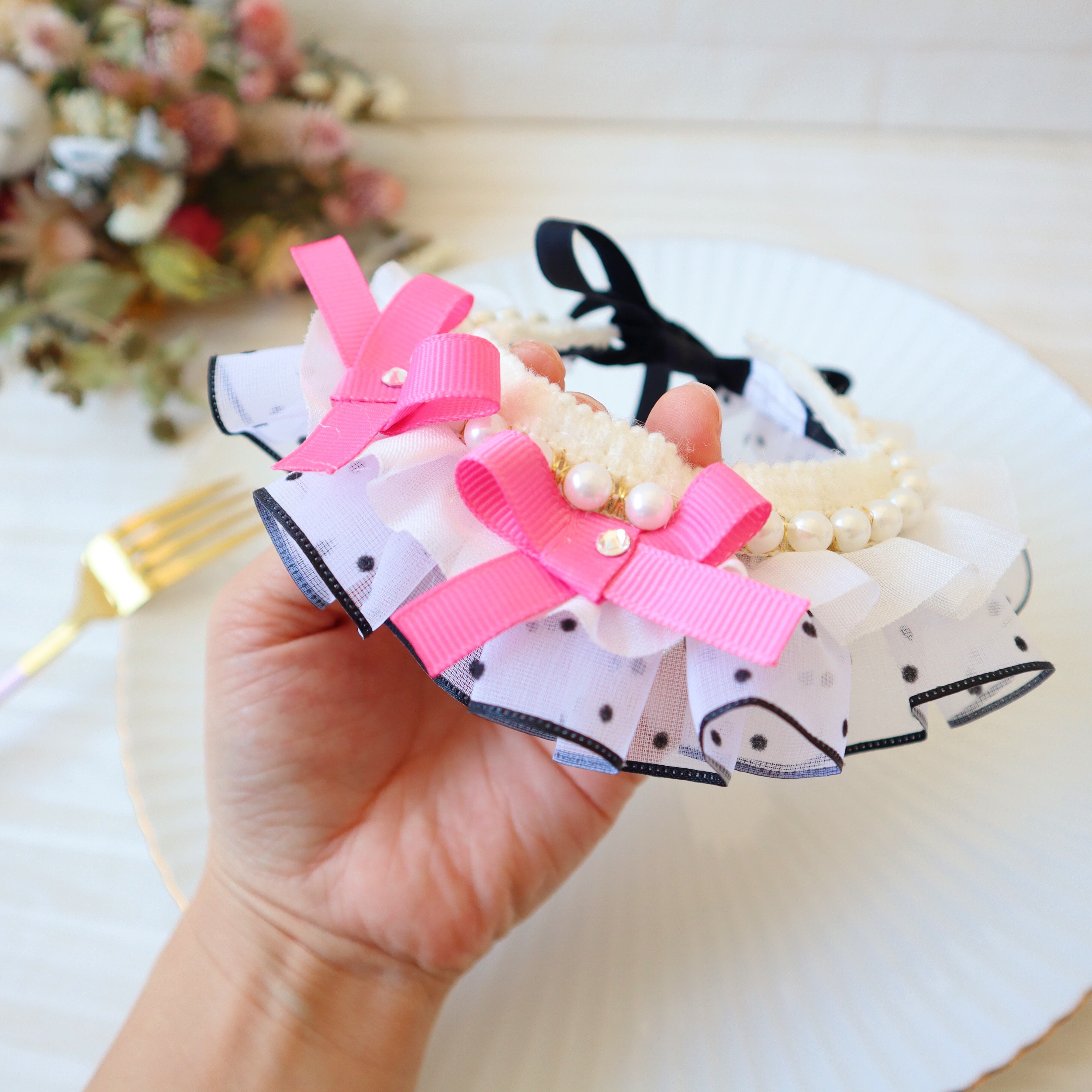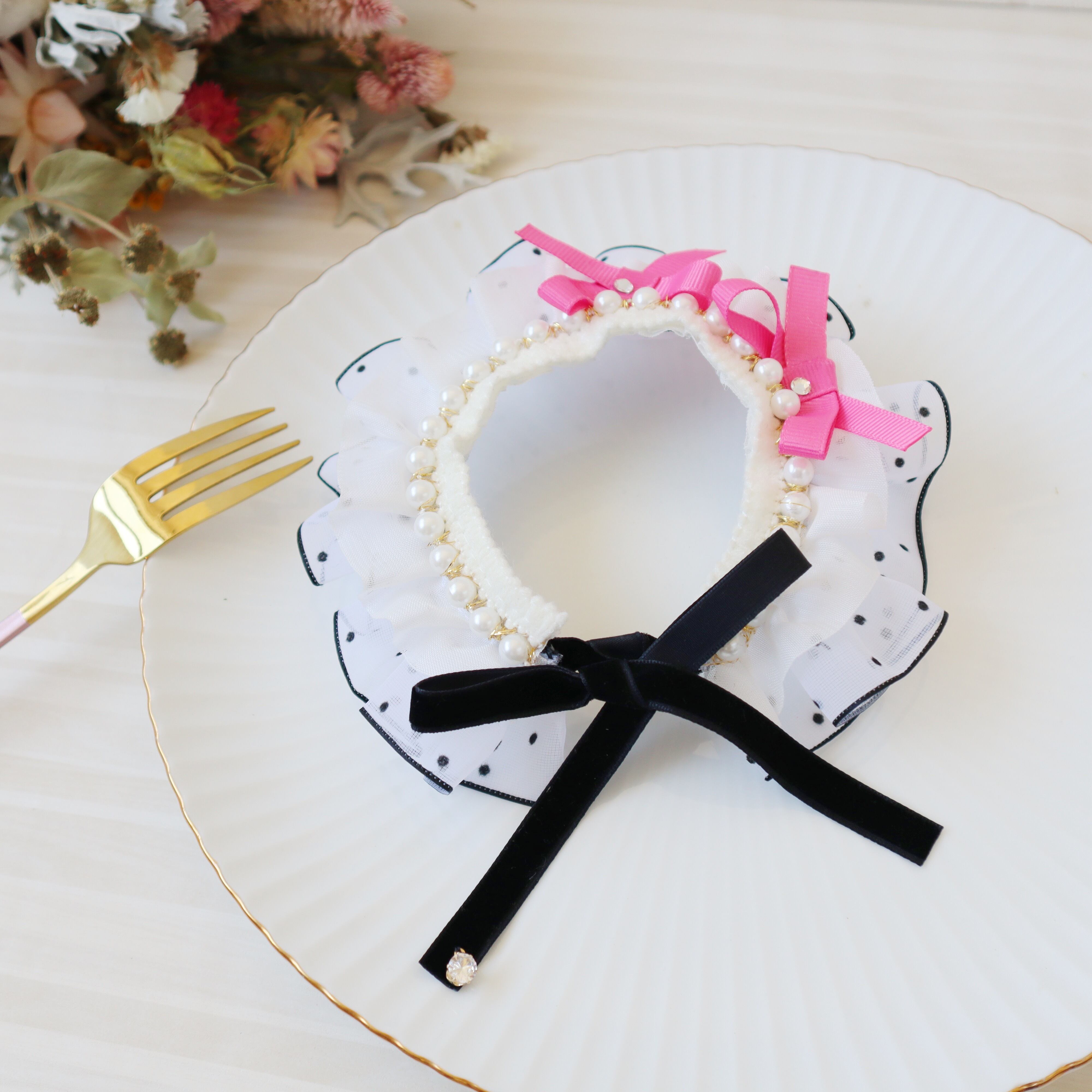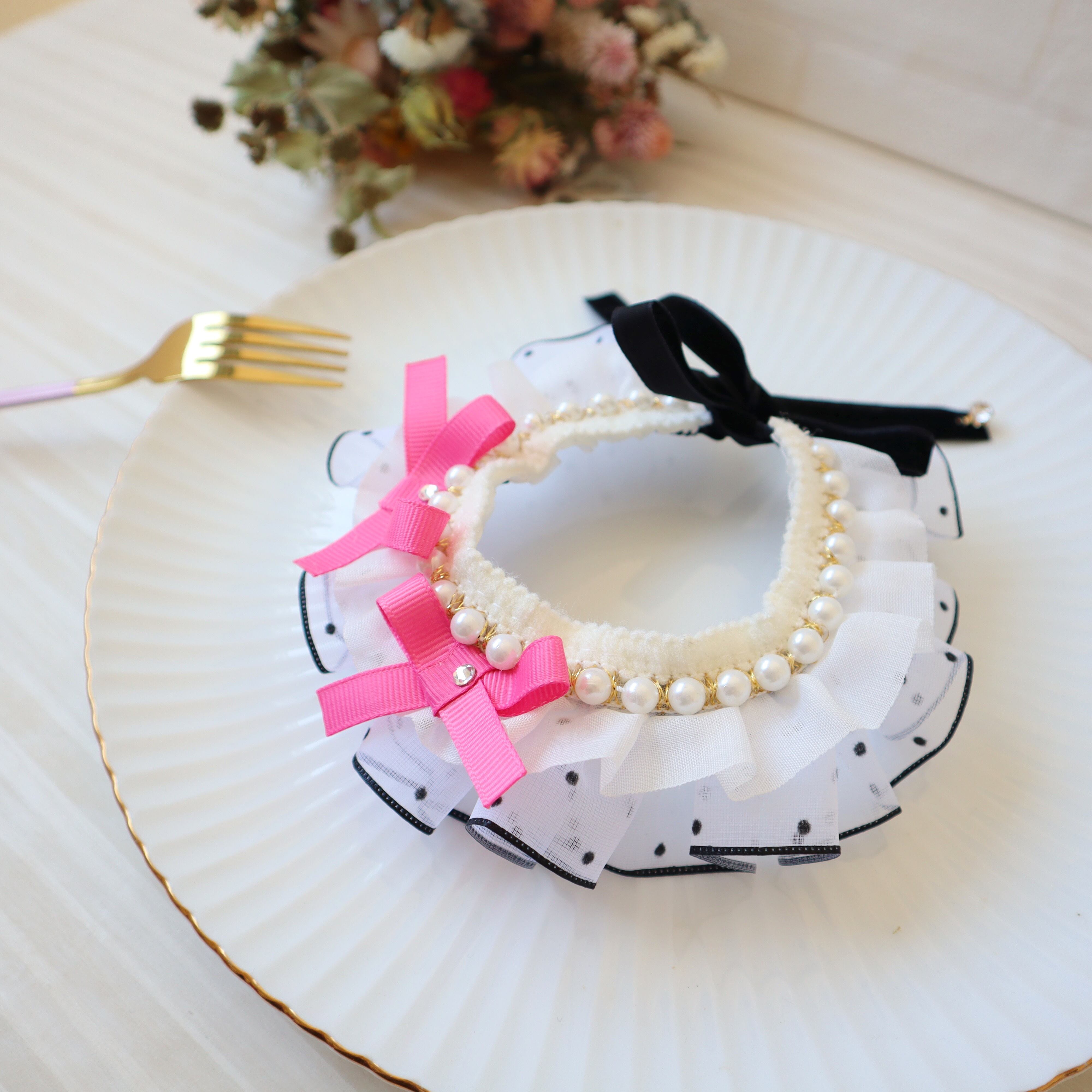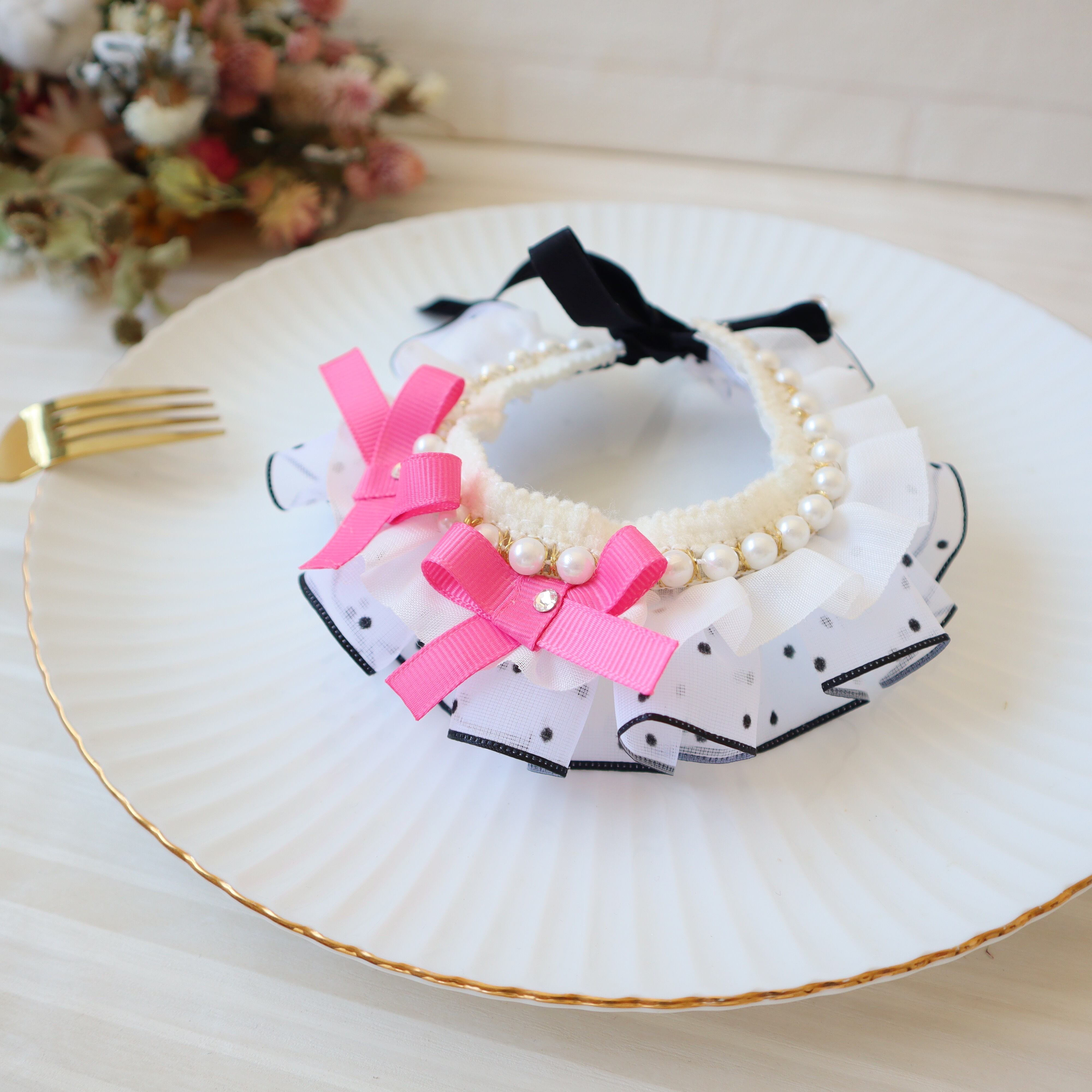 ドットのフリルリボンは、ひとつひとつギャザーを寄せて、可愛らしくボリュームを出しました。お顔周りが華やかになりますよ♪