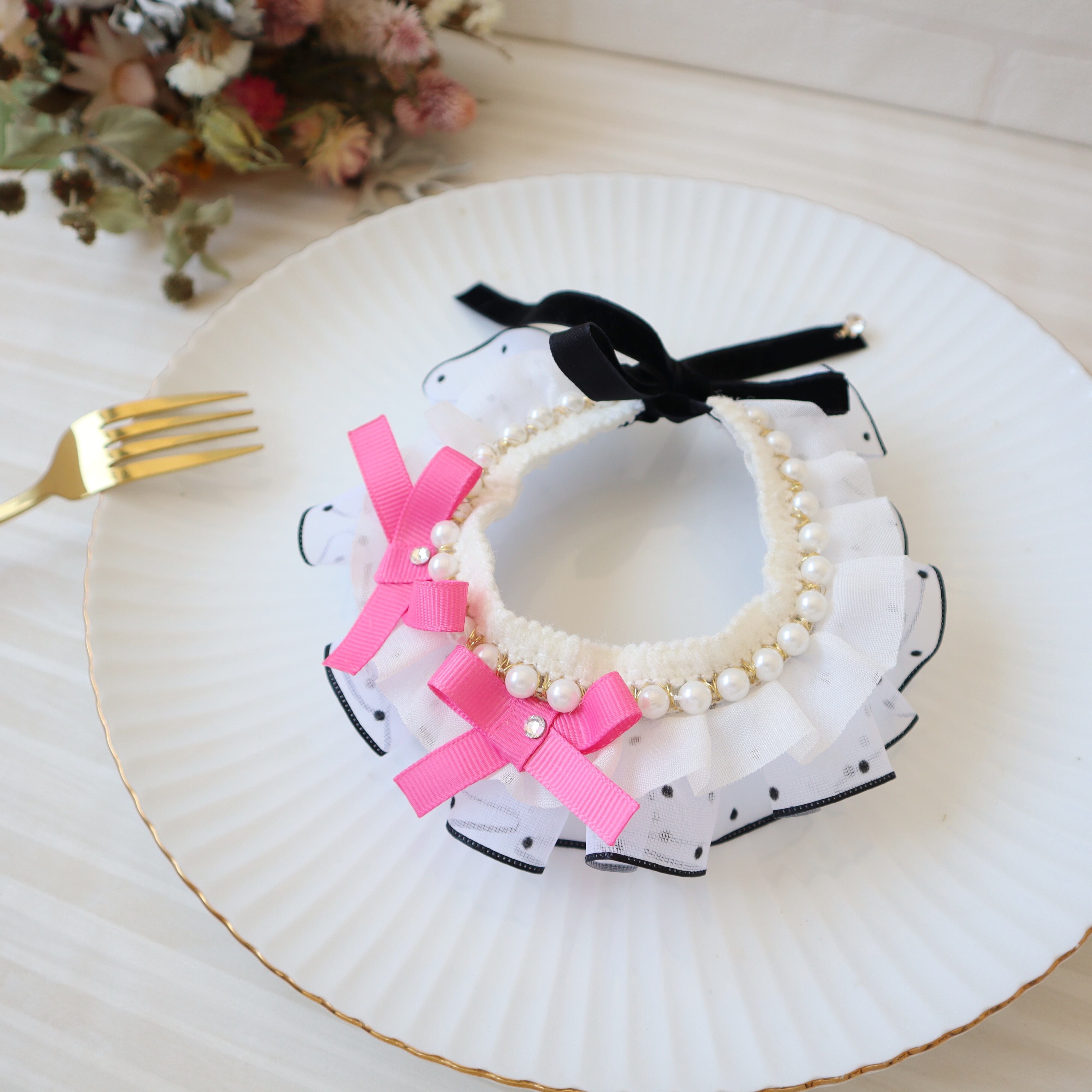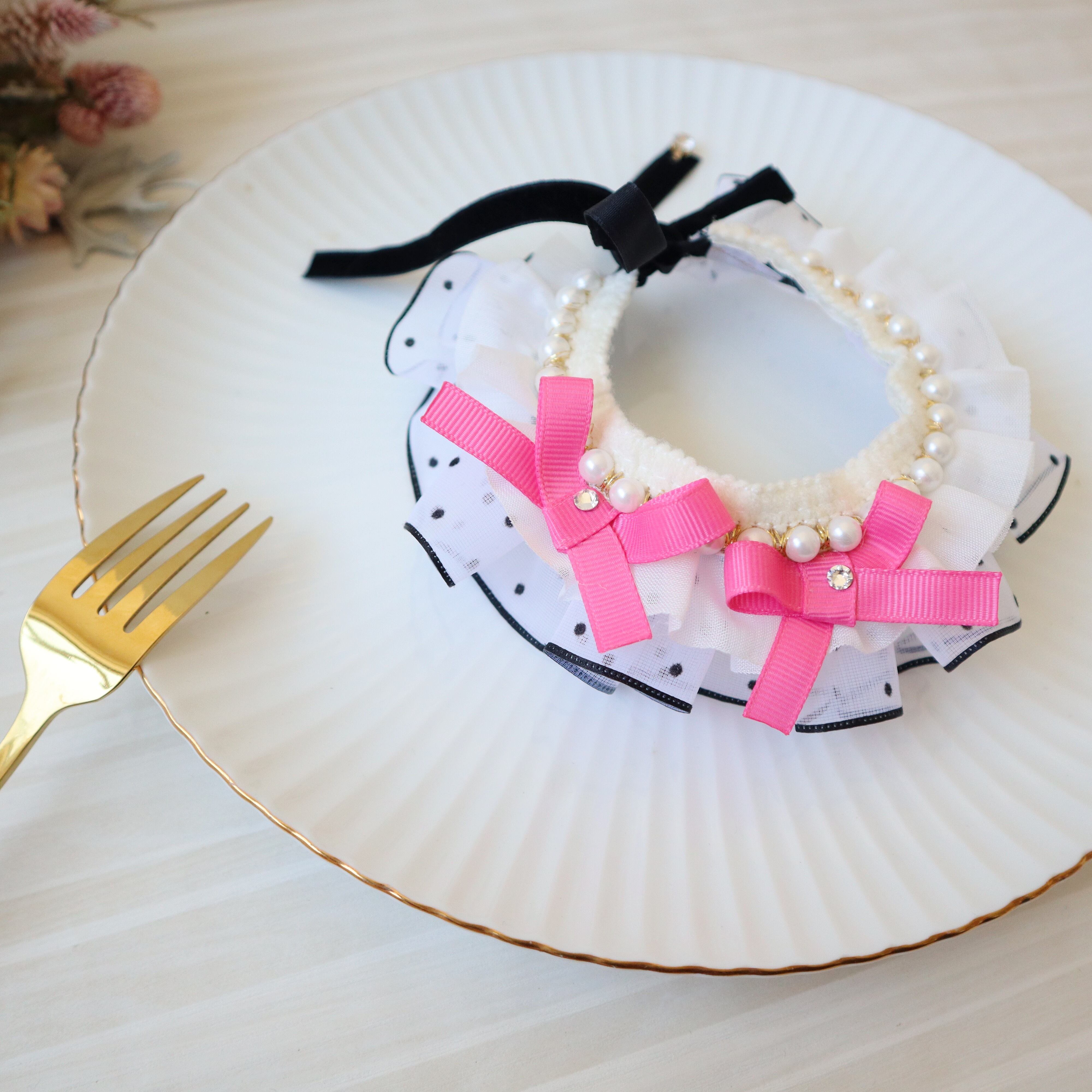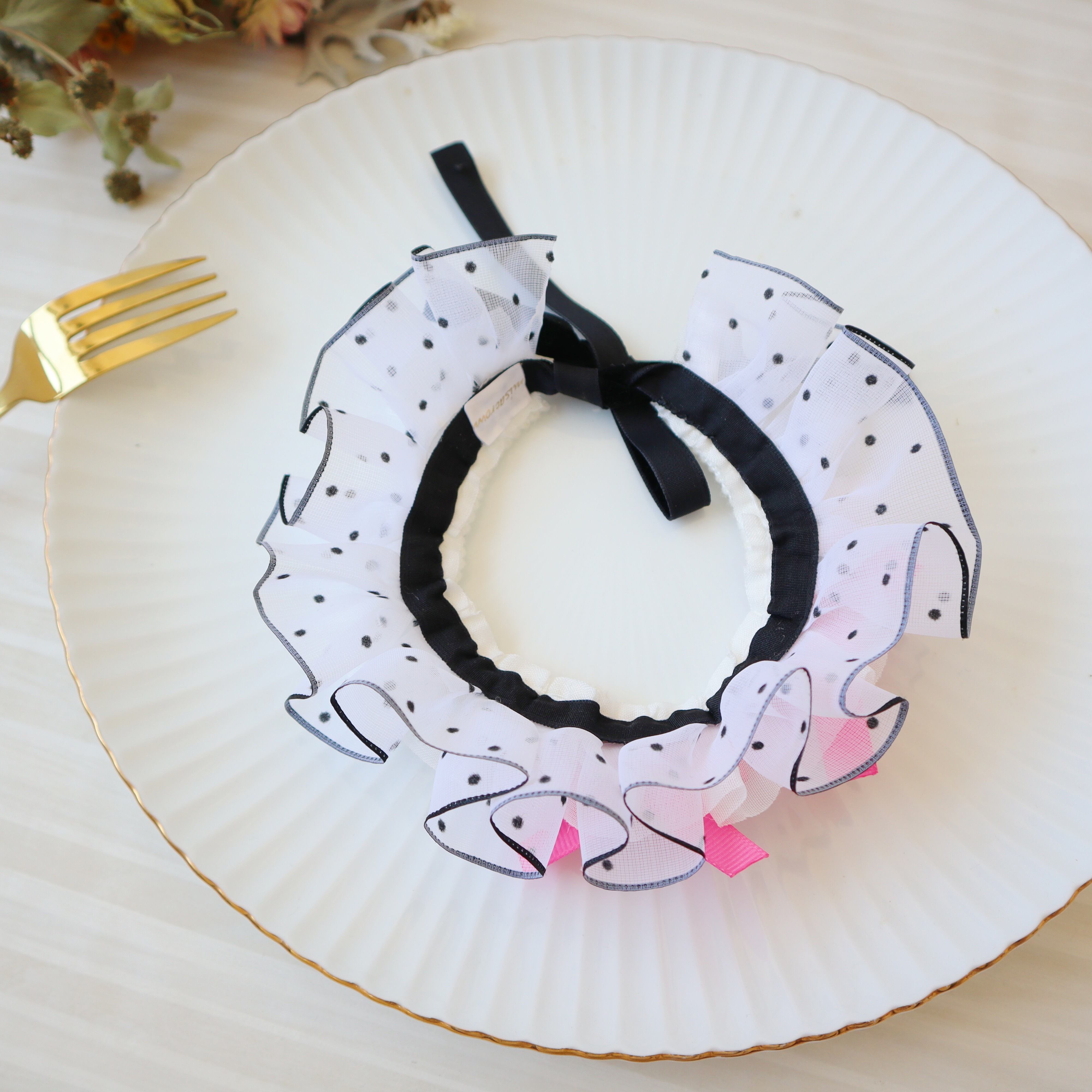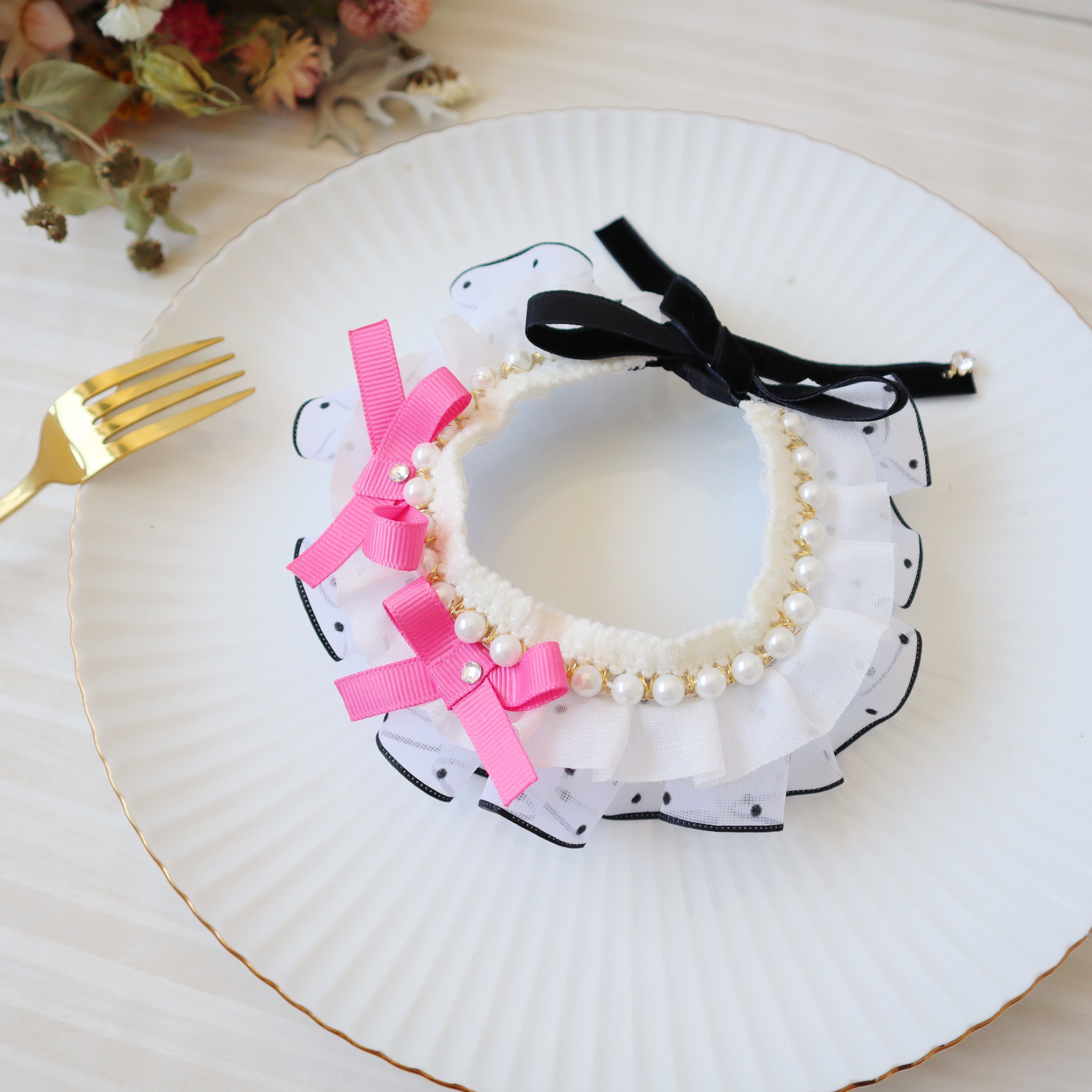 ドットのフリルリボンは、ひとつひとつギャザーを寄せて、可愛らしくボリュームを出しました。お顔周りが華やかになりますよ♪