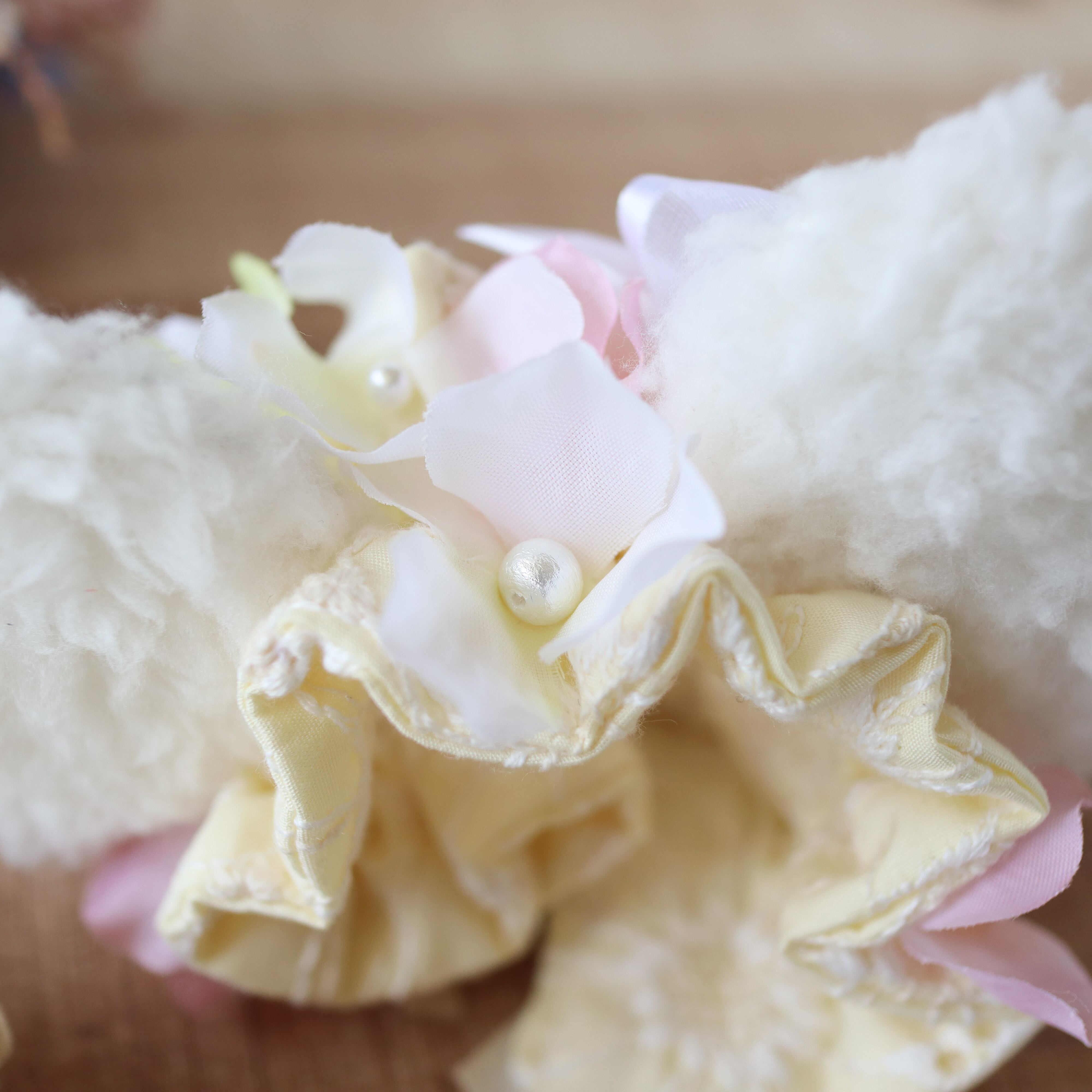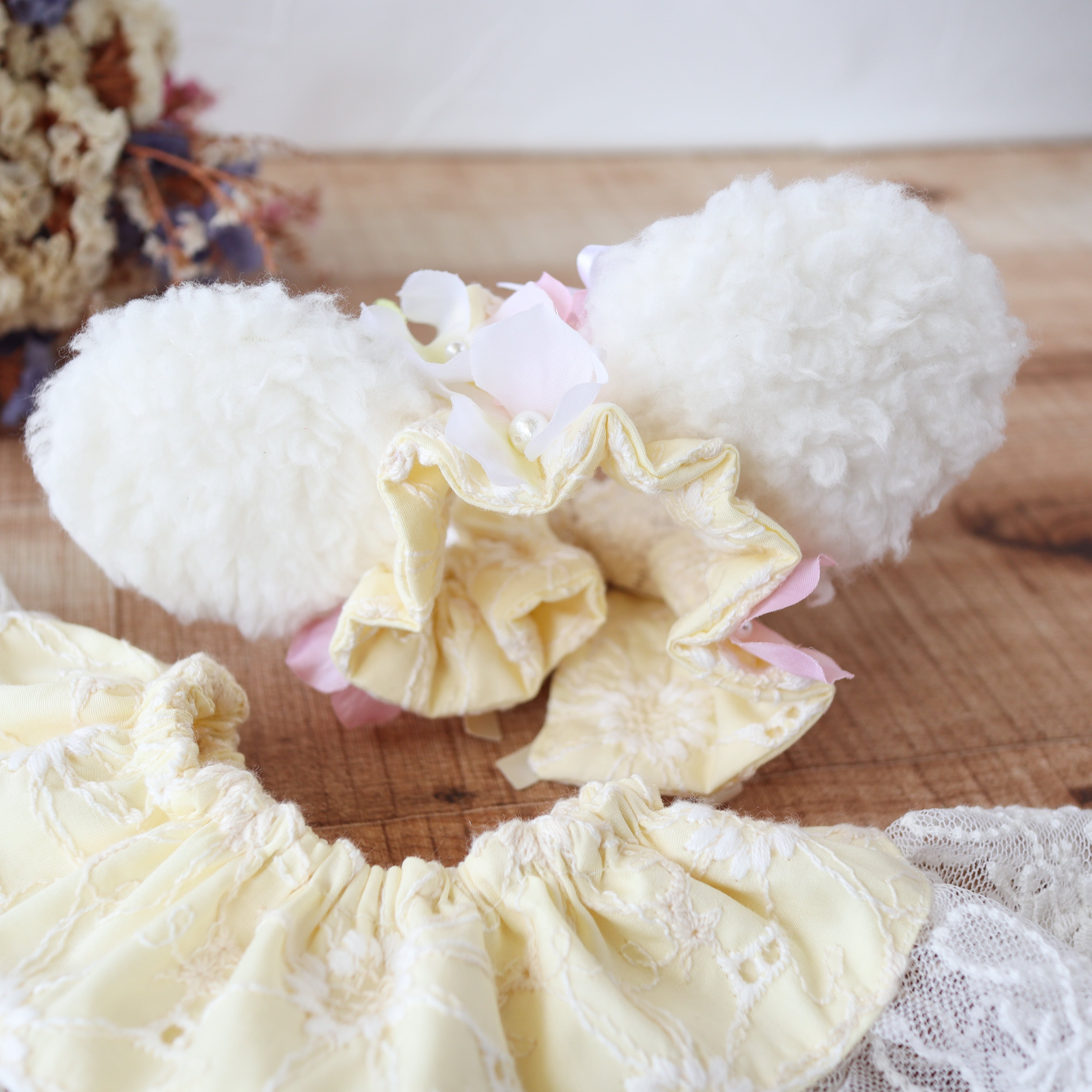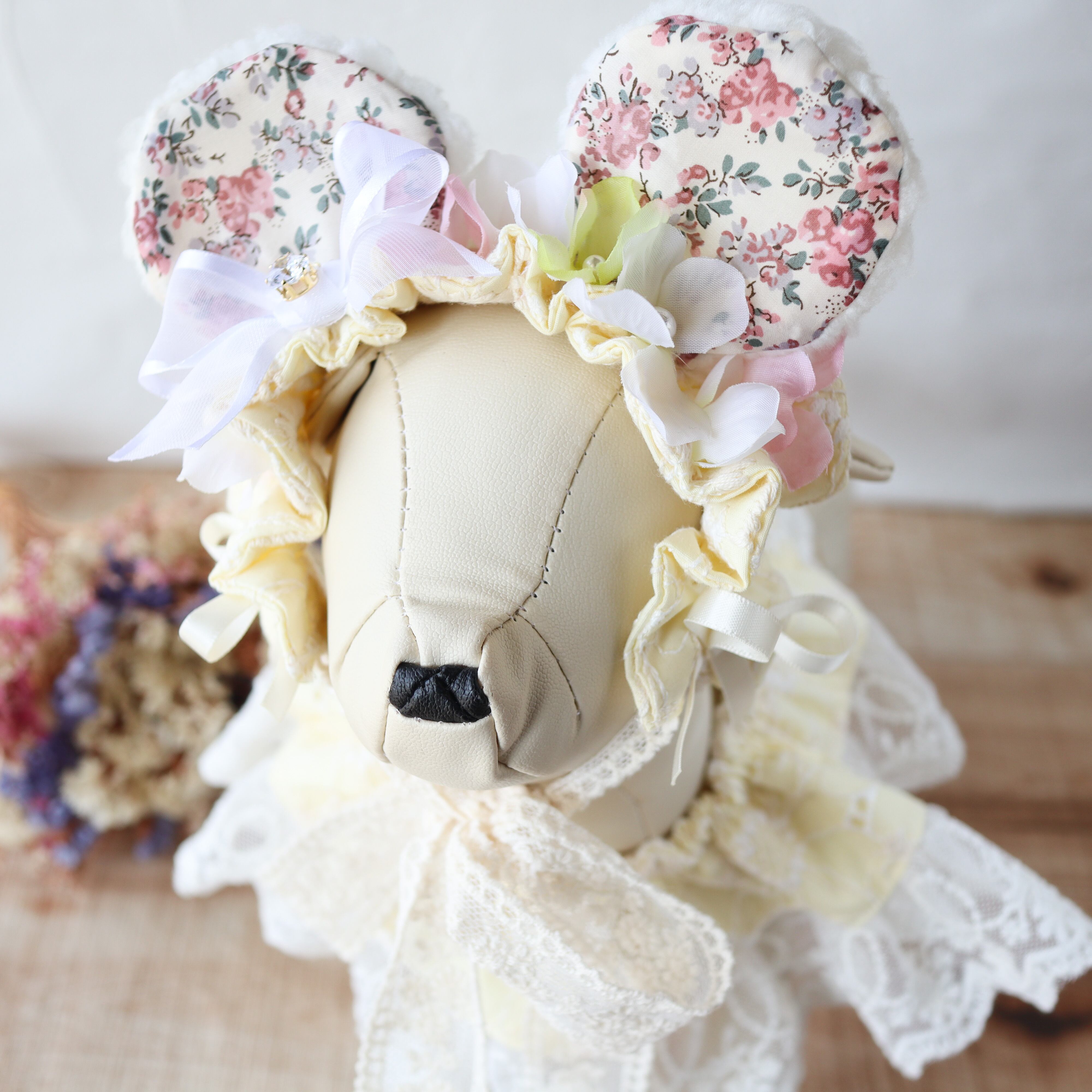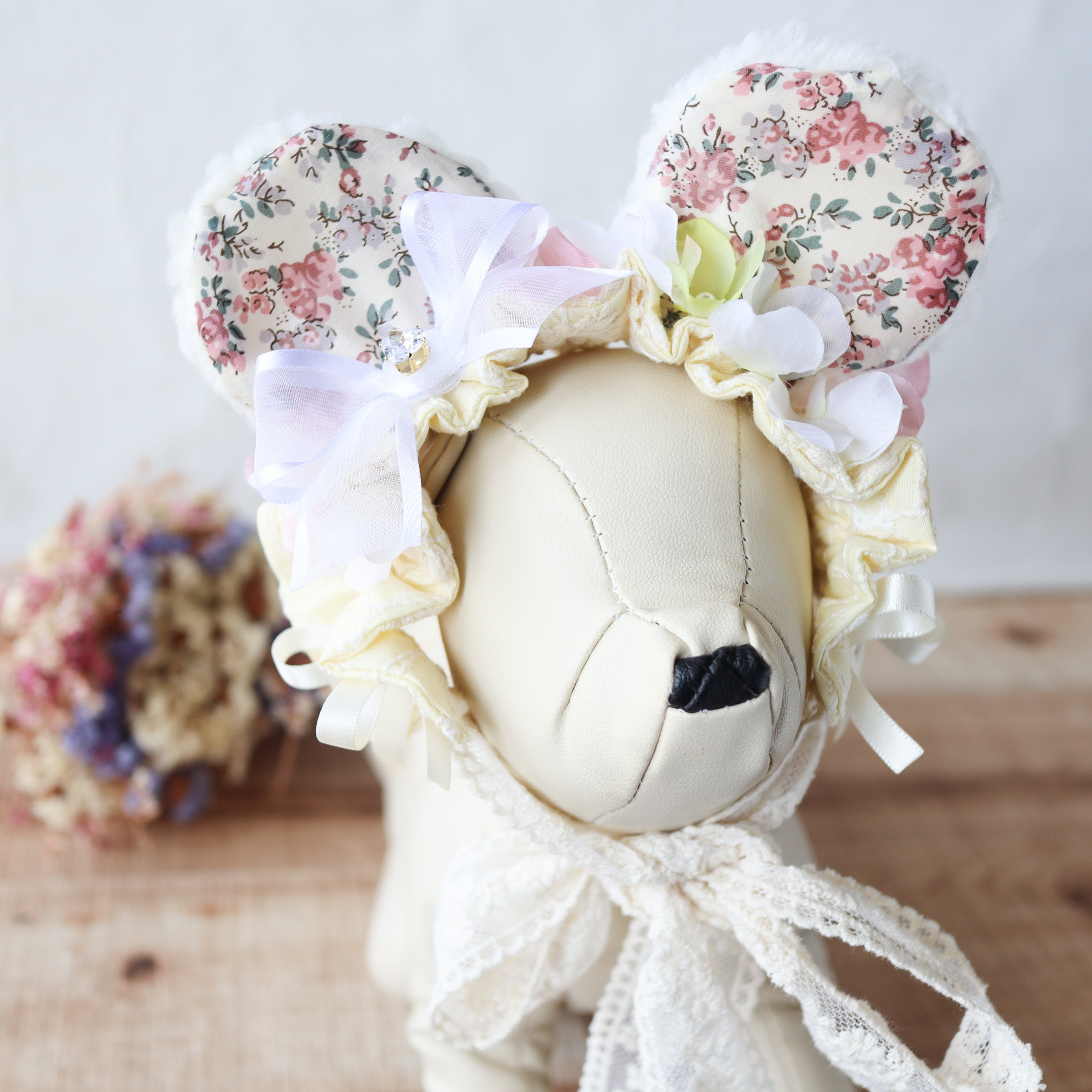 〇おみみ・・・外側ソフトボア/内側リバティ生地/レース生地・・綿100%/フラワーパーツ、コットンパール・・・すべて縫い付けております