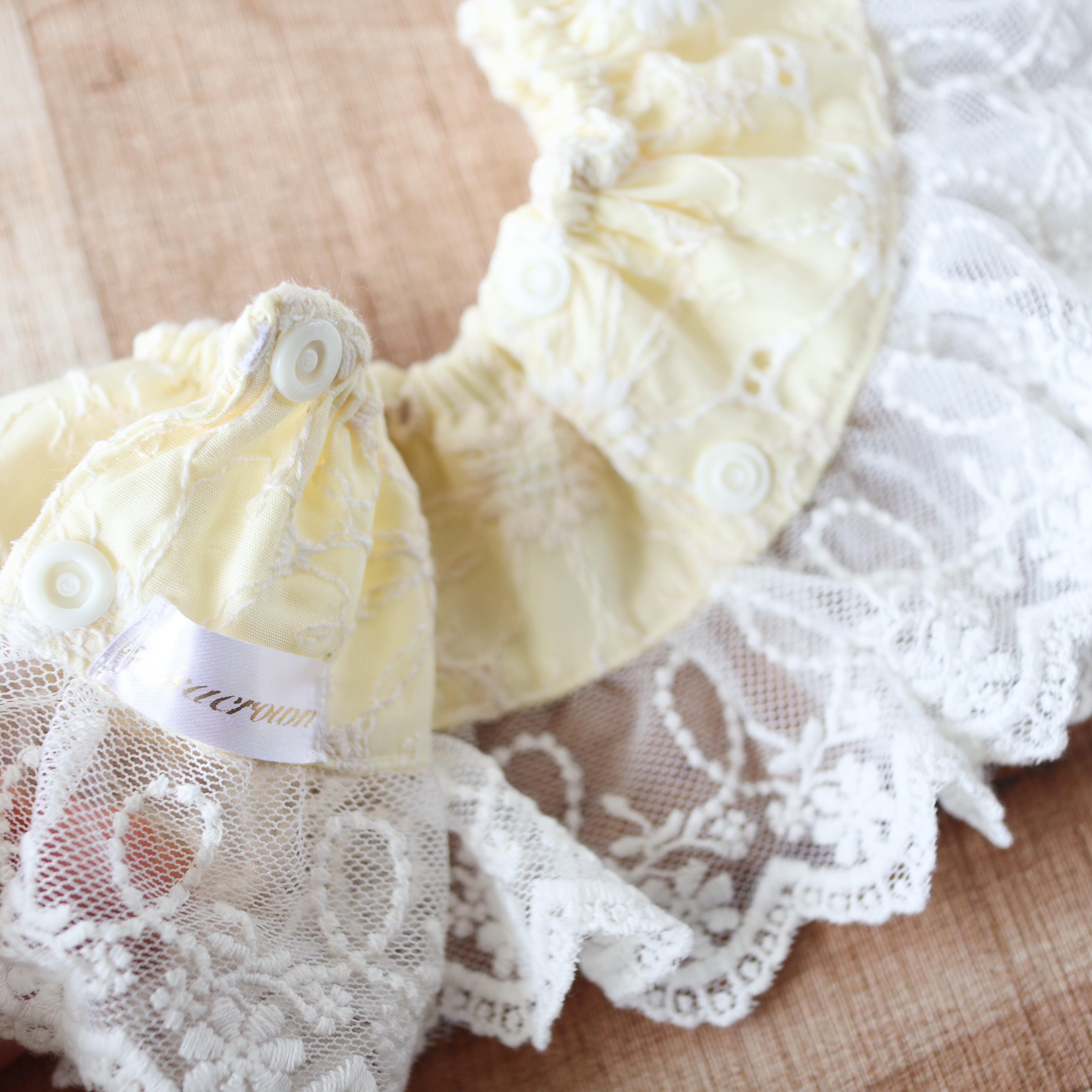 レース生地・・綿100% 首周りゴムを入れています/プラスナップにて着脱