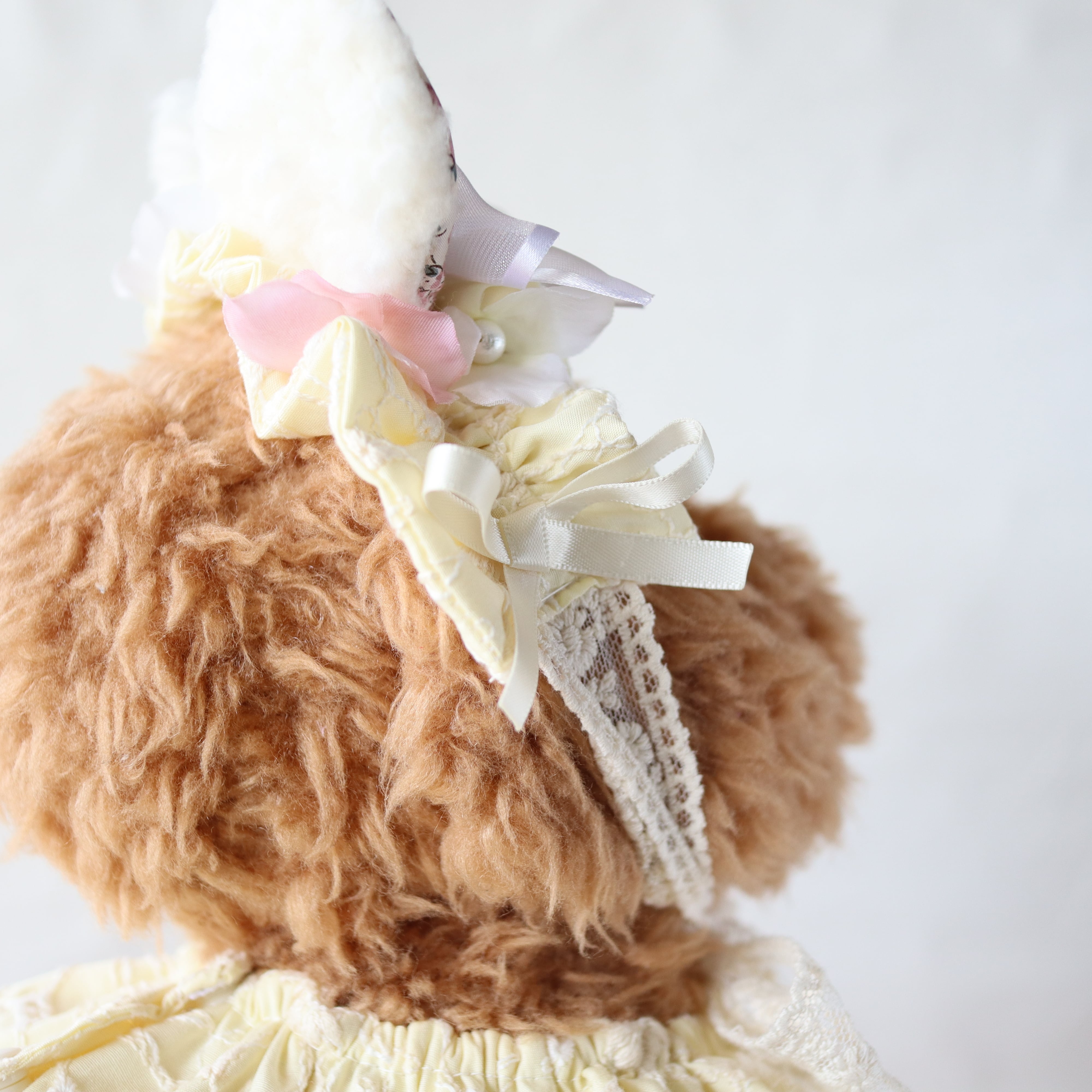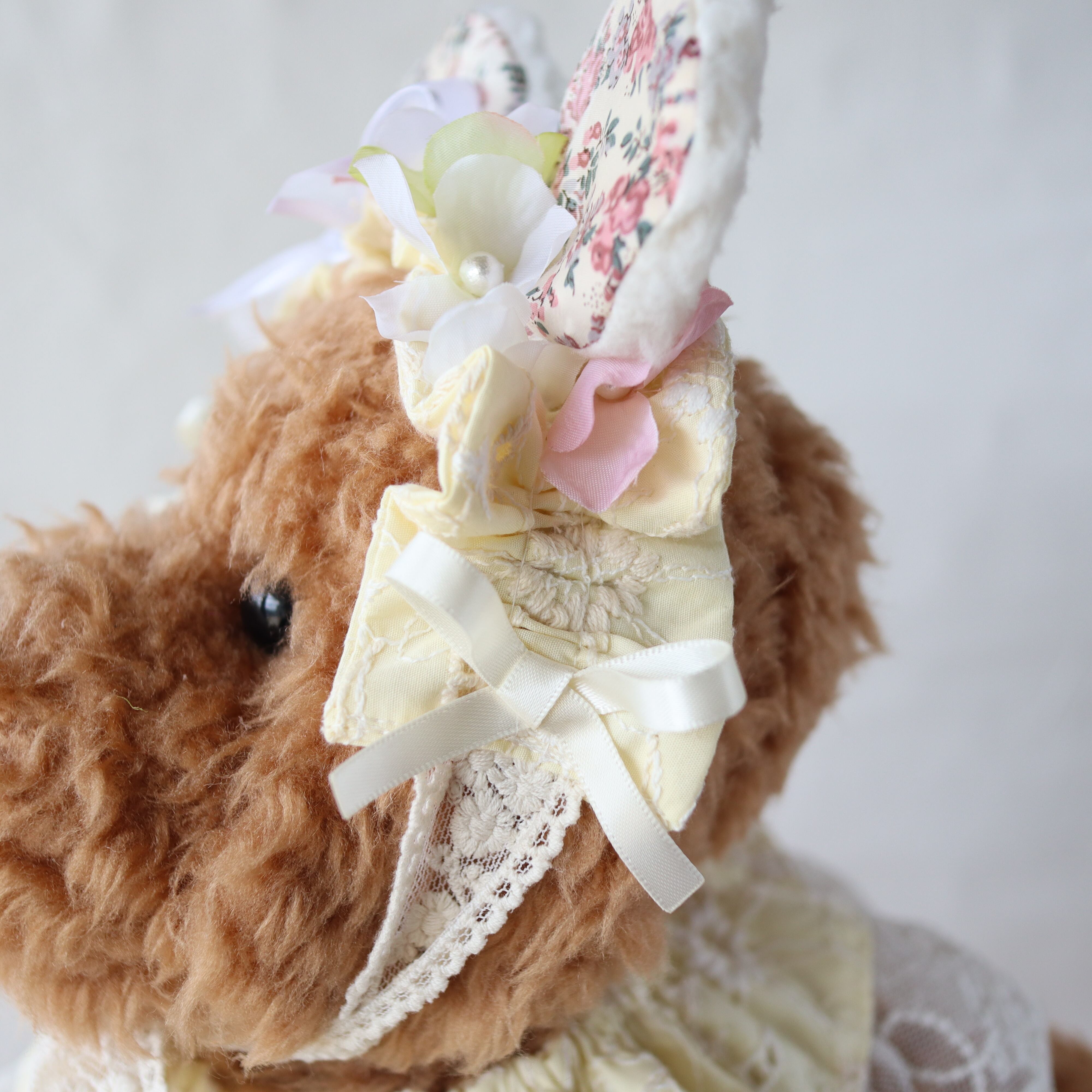 繊細なマーガレットの刺繍をあしらったエンブロイダリー生地に、手触りまでうっとりしてしまう、リバティ生地を使用した、もふもふお耳が可愛いくまさん。