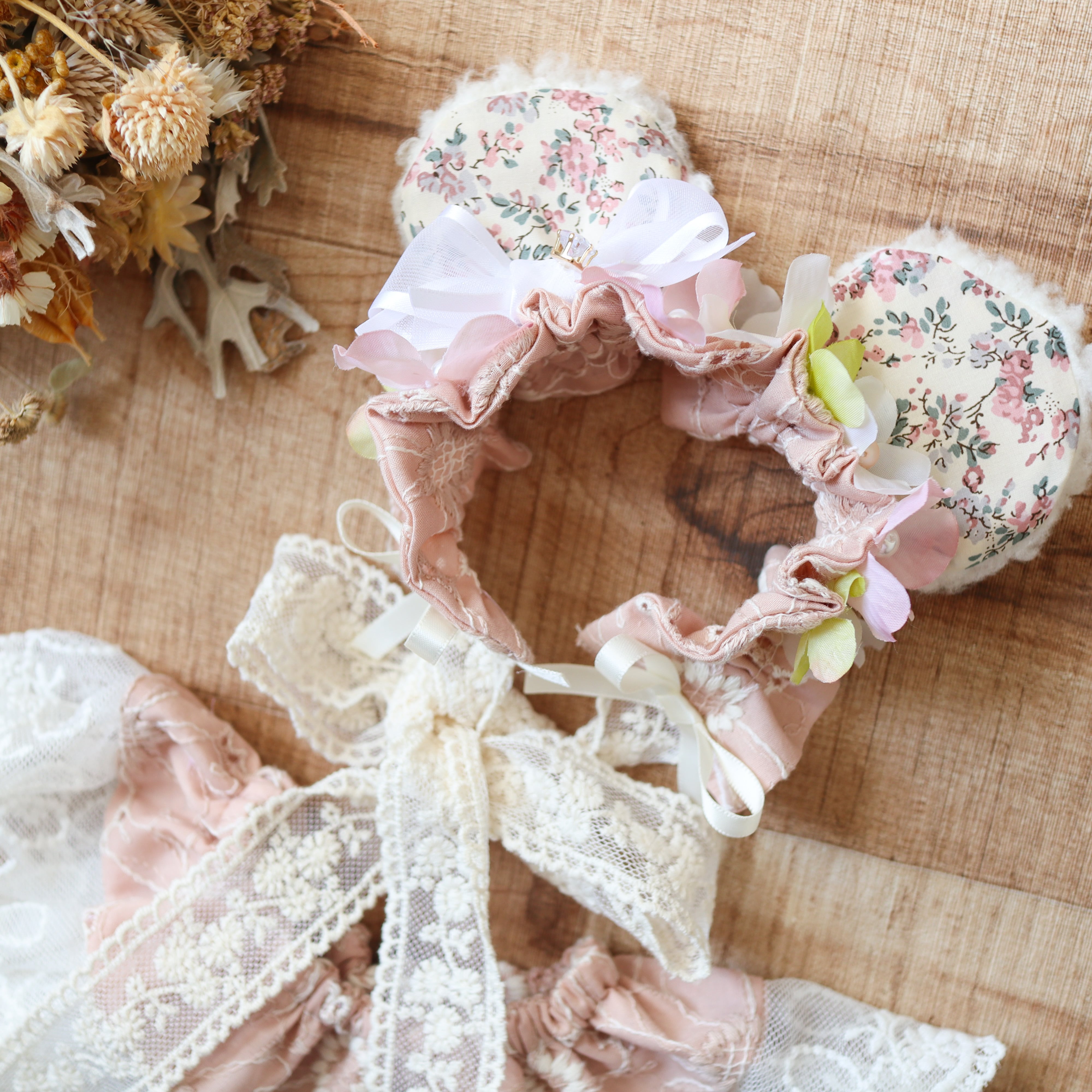 〇おみみ・・・外側ソフトボア/内側リバティ生地/レース生地・・綿100%/フラワーパーツ、コットンパール・・・すべて縫い付けております