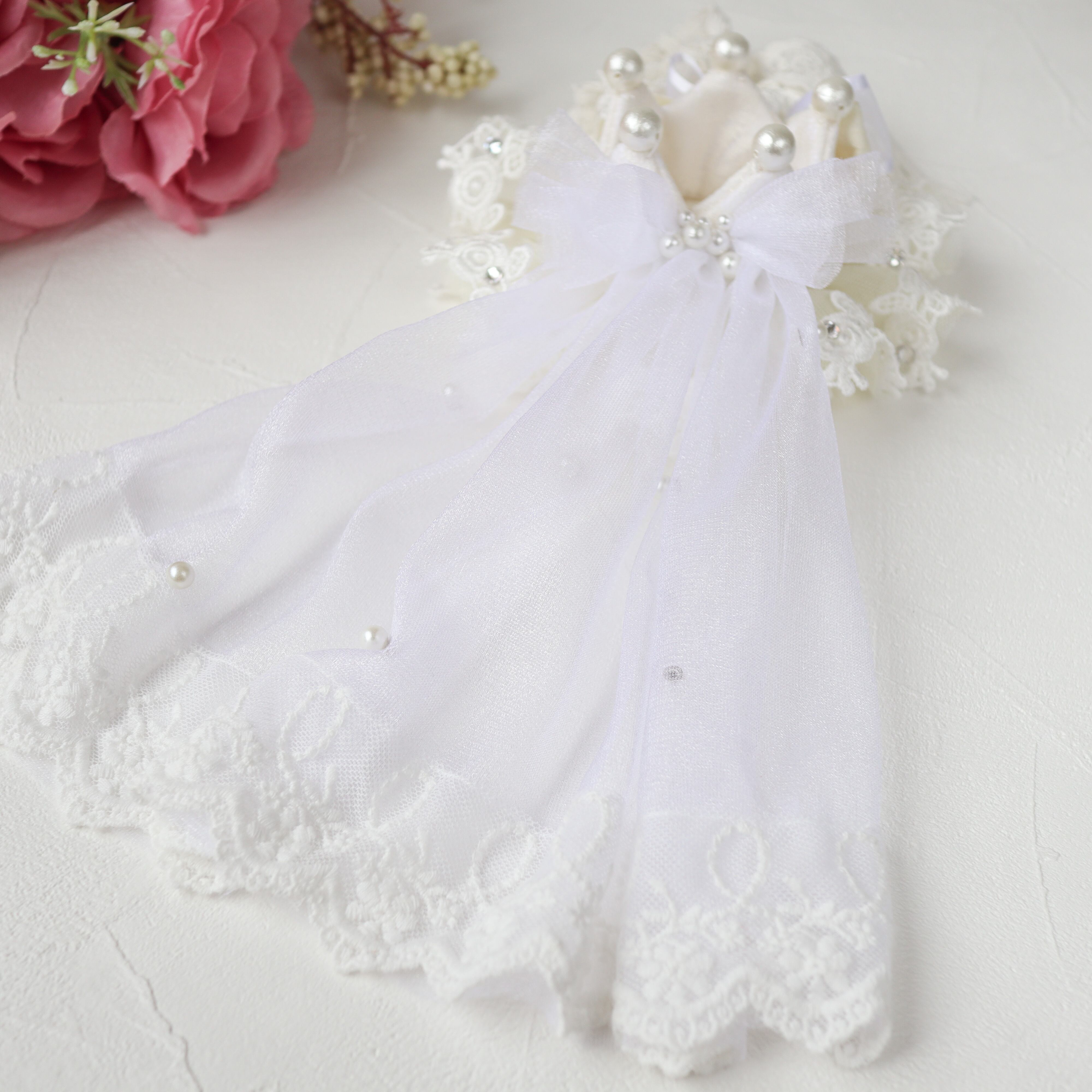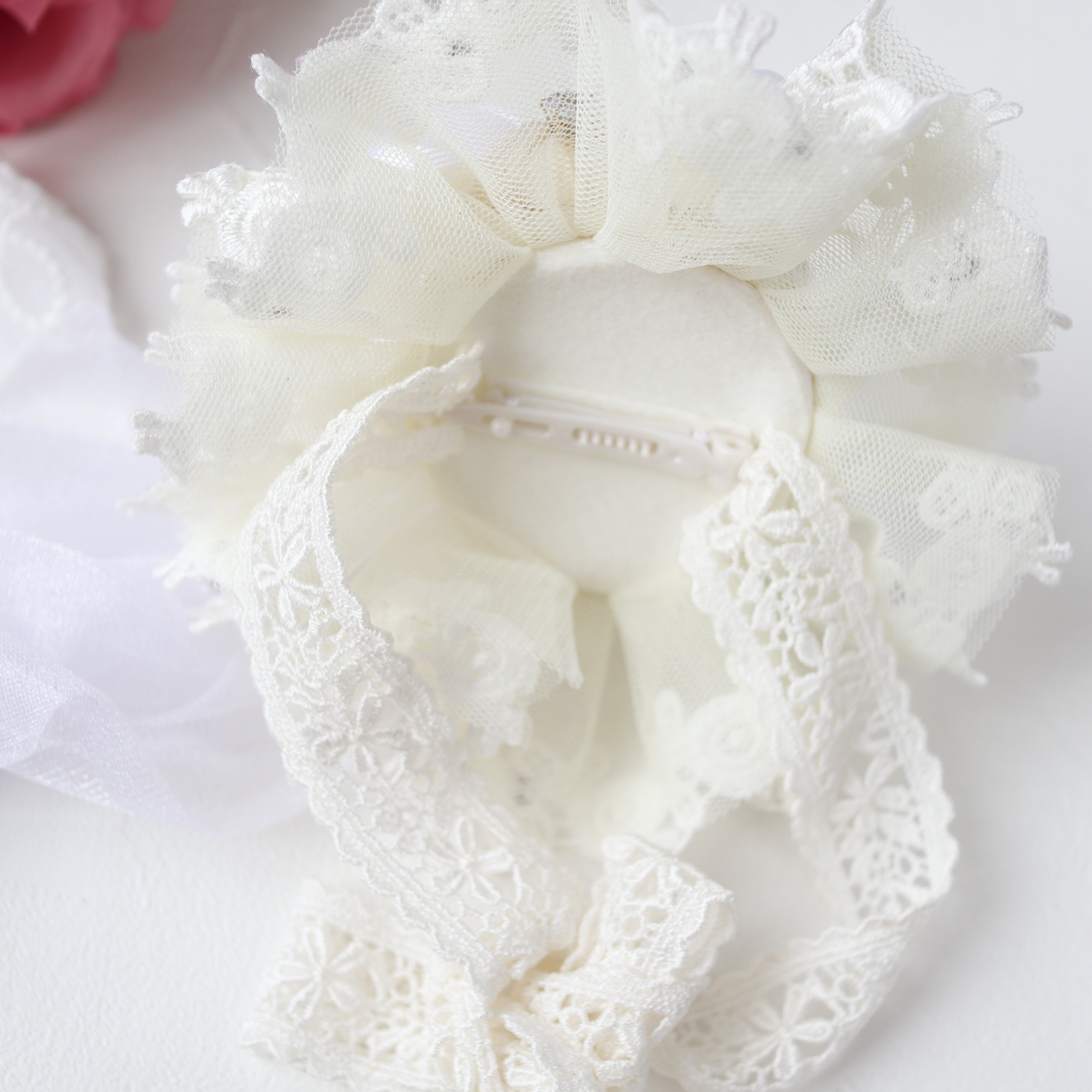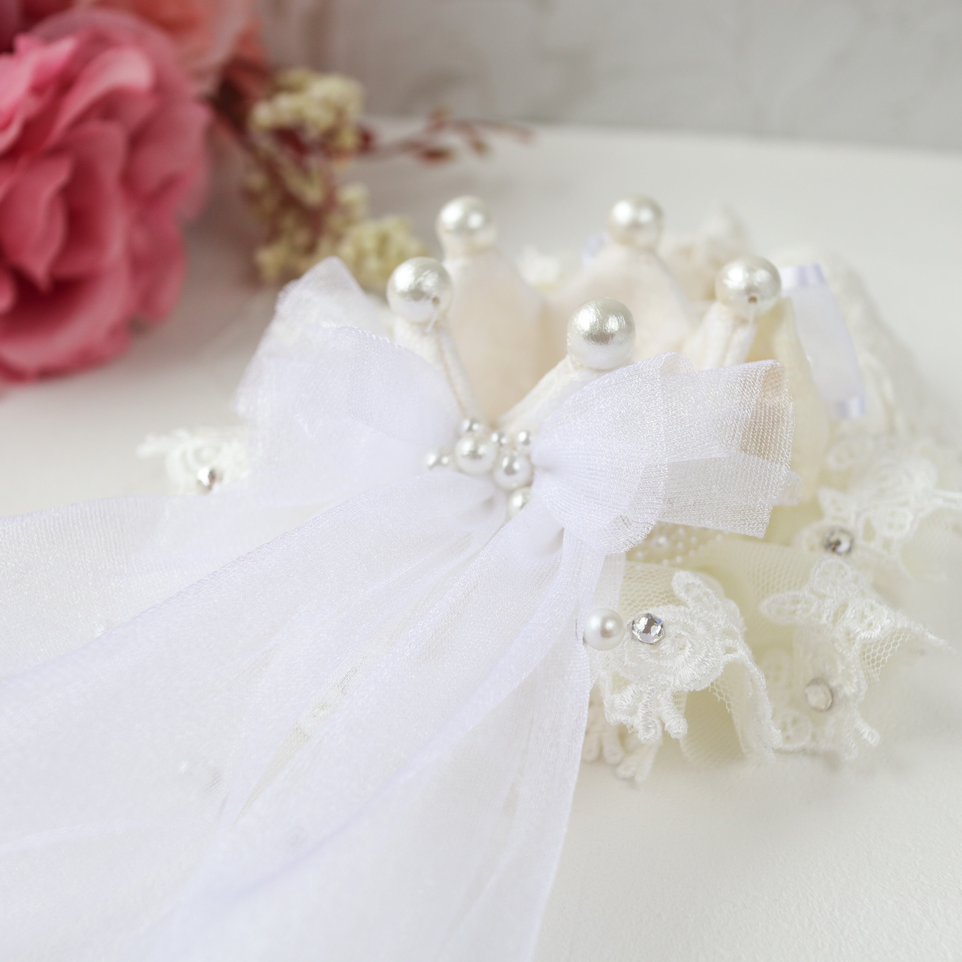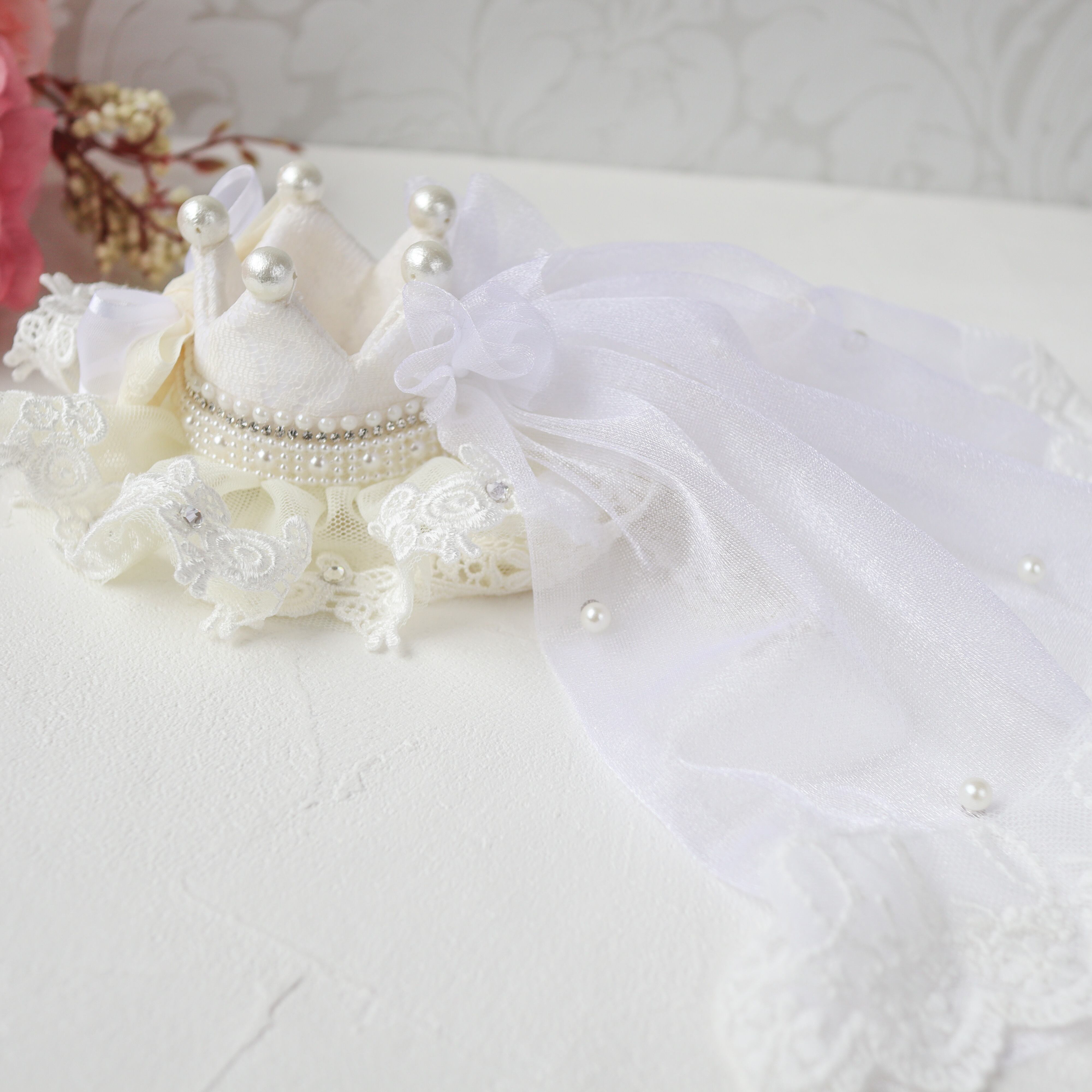 クラウン底面は、小さなにやちゃんの被りやすさを考えて今回は、JDバレッタを使用しています。アゴリボンはストッパーはつけておりませんので、リボン結びにしてご使用ください^^