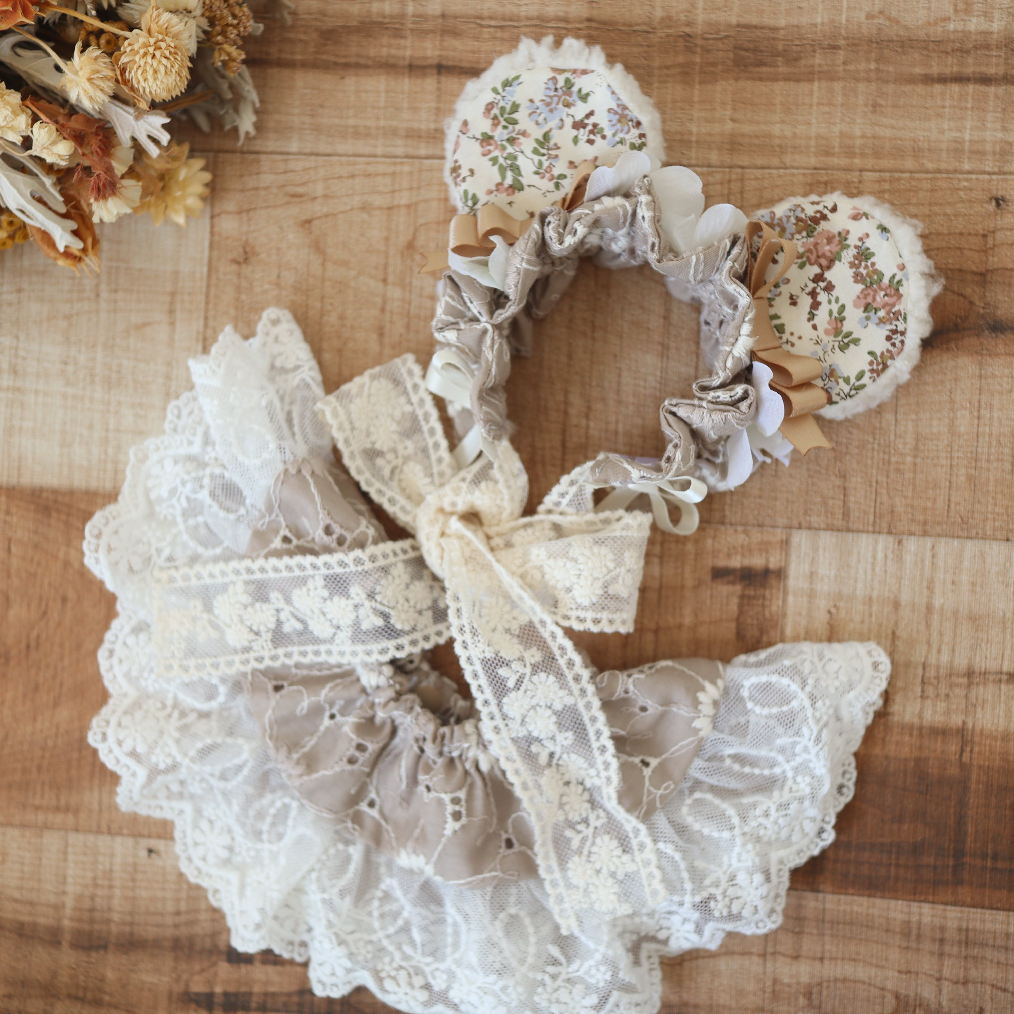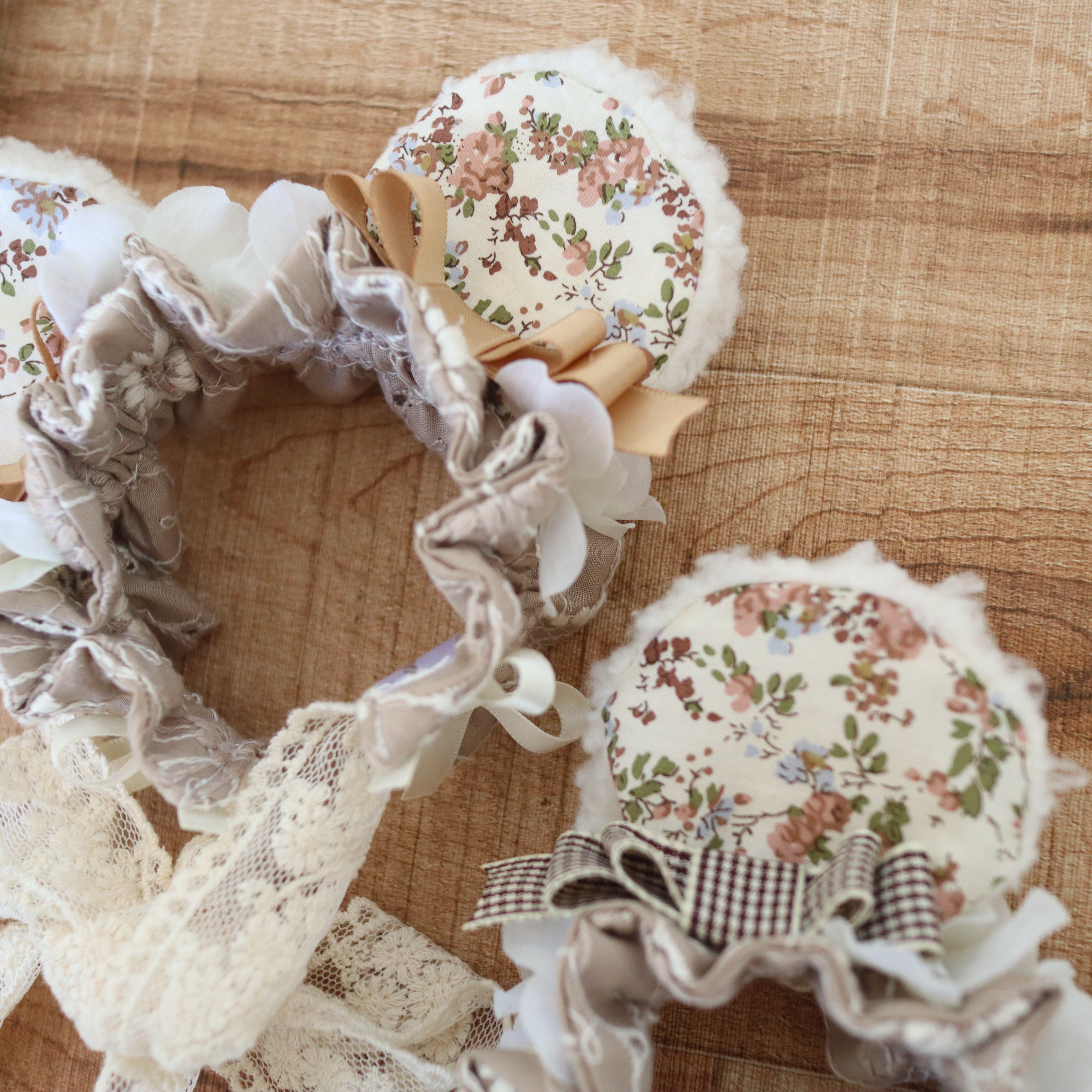 〇おみみ・・・外側ソフトボア/内側リバティ生地/レース生地・・綿100%/フラワーパーツ、コットンパール・・・すべて縫い付けております